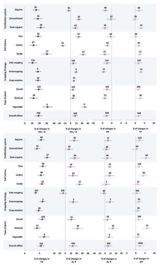 Percentage changes of soil properties affected by a variety of effective factors including fertilization systems, soil textures, cropping strategies, and types of plants. Subgroups with overlapped CIs on the vertical zero line suggest no significant change in property. Subgroups with overlapping CIs with each other were not significantly different.