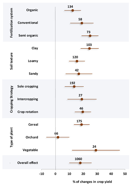 The percentage changes of crop yield affected by different variables are presented in Figure 4. Based on the results, all systems of fertilization increased crop yield, and the highest effect size was observed in the semi-organic system with a positive percentage change of 24.9%. The second highest crop yield was related to the conventional system of fertilization with a 19.1% positive effect size. However, it should be noted that the semi-organic and conventional systems did not have a statistically significant difference from each other. The organic system of fertilization resulted in a 12.4% positive effect size in crop yield, which had a significant difference from the semi semi-organic system. Among the soil textures, the clay texture soils caused a positive effect size of 24.6% in terms of crop yield. On the other hand, loamy and sandy soils did not show a significant difference from each other, with an average positive effect size of 16.2%. In the case of cropping strategies, all three strategies showed a positive increase in crop yield without a significant difference from each other. However, crop rotation and intercropping showed a better performance with a positive effect size of 19.5% on average. The results of the meta-analysis showed a significantly higher percentage change of crop yield in vegetables and cereals compared with orchards. In detail, vegetable and cereal cultivations resulted in 29.1% and 18.9% positive effect sizes in crop yield, respectively.