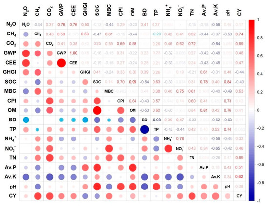 The Pearson correlations between all GHG and soil properties and crop yield affected by effective variables are presented in Figure 5. The results showed a positive correlation between all gases and GWP with a determined coefficient (R2) as follows: N2O vs. GWP (0.76), CH4 vs. GWP (0.59), and CO2 vs. GWP (0.41). Also, there was a negative correlation between GHGI and crop yield with R2 = −0.44. The total porosity showed a negative correlation with CH4 (R2 = −0.23), while positive correlations with other GHG indices were as follows: TP vs. N2O (0.27), TP vs. CO2 (0.26), TP vs. GWP (0.23), TP vs. CEE (0.21), and TP vs. GHGI (0.26). It should be noted that there was a positive correlation between available nitrate and ammonium vs. crop yield, with an R2 of 0.33 and 0.46.