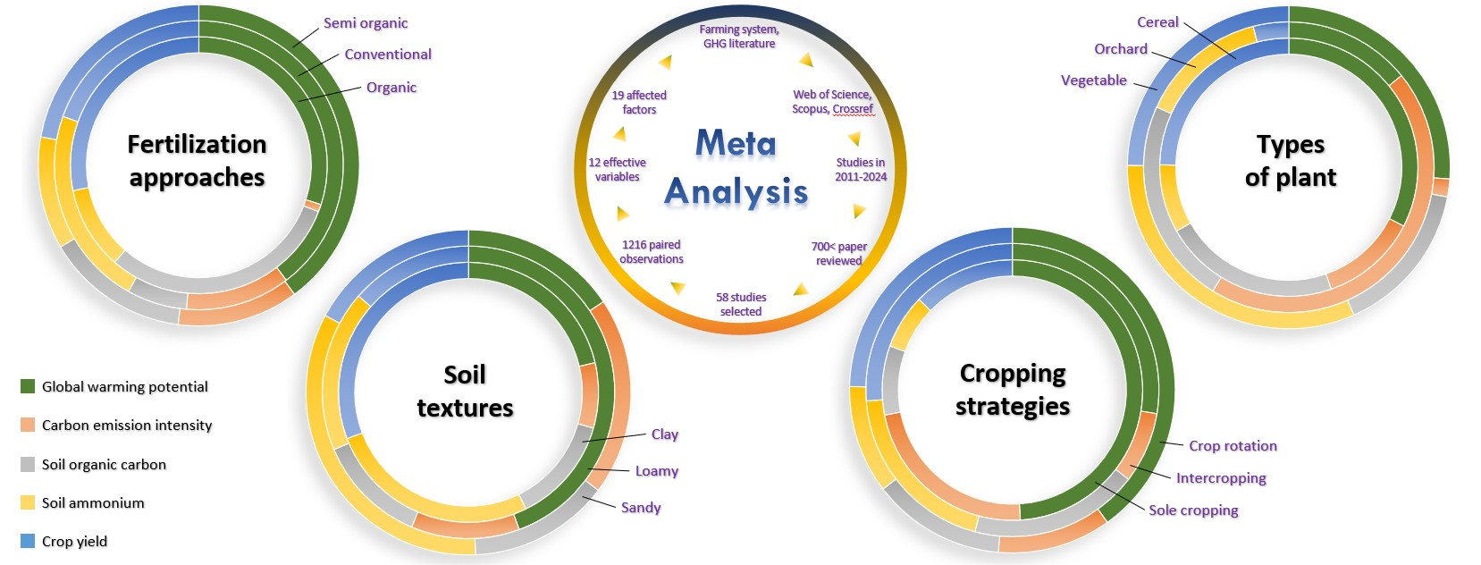 To gain a deeper comprehension of the dynamics of nutrients between soil, plants, and atmosphere, the primary focus should be on the way various soil characteristics and management approaches affect certain biological, chemical, and physical alterations in agricultural fields. Given the variability in findings across the literature, a thorough evaluation of conventional, organic, and integrated fertilization practices is essential. To date, no single study has simultaneously assessed multiple agricultural systems with varying cropping strategies concerning their impacts on GHG emissions, soil characteristics, and crop performance. This gap strongly emphasizes the need for a meta-analysis that can integrate and compare results across diverse fertilization and cropping systems, accounting for variations in soil types, plant species, and management practices, to provide a clearer and more comprehensive understanding of their relative impacts on greenhouse gas emissions, soil health, and crop productivity. Such a synthesis is essential to guide evidence-based recommendations for sustainable agricultural management and identify strategies that optimize both productivity and environmental outcomes. Therefore, this study conducted a meta-analysis to offer a clearer understanding of how farming practices, cropping approaches, and inherent soil conditions affect greenhouse gas emissions, carbon indicators, soil health, and crop productivity. To do this, the effects of (i) three fertilization strategies (conventional, organic, semi-organic), (ii) three soil textures (sandy, loamy, clay), (iii) three cropping strategies (sole cropping, intercropping, crop rotation), (iv), and three types of plants (cereal, vegetable, orchard) on GHG emissions, carbon indices, soil properties, and crop yield were meta-analyzed comprehensively.