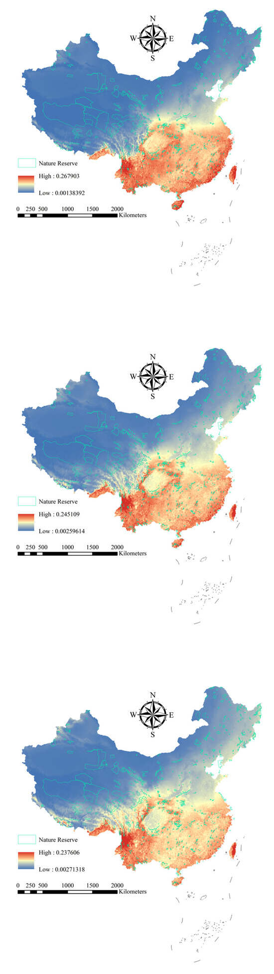 Despite the numerically low average distribution probabilities (e.g., <0.25), these values should not be interpreted as an indicator of low overall risk. The MaxEnt model outputs represent a relative index of environmental suitability rather than an absolute probability of occurrence. In large-scale ecological niche models encompassing vast and environmentally heterogeneous regions like China, absolute suitability values are naturally attenuated. The critical insight lies not in the absolute value, but in the relative spatial patterns and the temporal shifts they reveal. Our identification of high-risk areas and species is based on this relative framework. The designated hotspots (e.g., Diaoluoshan) exhibit suitability scores that are markedly higher than the vast majority of the landscape. Furthermore, the significant northward and westward expansion of suitability, quantified by the positive logarithmic response ratios (RR) in many nature reserves (e.g., RR585 > 0.4 for Chonar River), indicates a substantial increase in invasion potential due to climate change. For invasive species, even a modest shift from negligible suitability (e.g., ~0) to low suitability (e.g., 0.1–0.2) can be ecologically transformative, as it opens previously inaccessible regions to potential colonization.