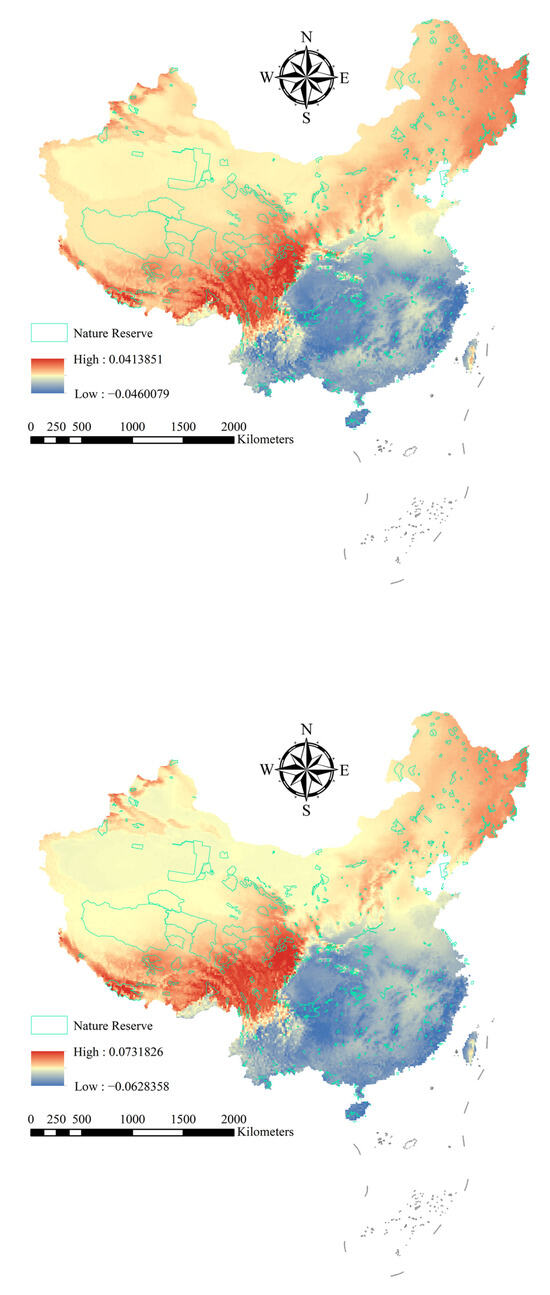 In order to assess the impacts of climate change on the risk of invasion, the logarithmic response ratio (RR) was calculated as RR = ln (Xf/Xc), where Xc and Xf represent the mean invasion risk scores for grid cells within each nature reserve under current and future climate conditions, respectively [79]. This metric is employed to quantify the proportional change in invasion risk, with positive RR values denoting elevated future risk and negative values indicating reduced vulnerability. The RR transformation provides a standardized measure of climate-mediated risk shifts across reserves while maintaining the ratio’s original proportionality [80].