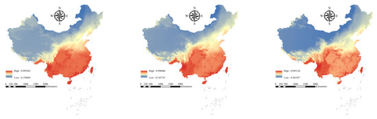 Under the current climatic conditions, the average distribution probability alien woody plants of in national nature reserves shows obvious regional differences. The average distribution probability of alien woody plants in nature reserves in southern provinces such as Hainan is generally high (Figure 1), especially in nature reserves such as Diaoluoshan National Nature Reserve (Average distribution probability = 0.227), Zhangjiangkou Mangrove Forest National Nature Reserve (average distribution probability = 0.214), Wuzhishan National Nature Reserve (average distribution probability = 0.213), Dongzhai Harbor National Nature Reserve (average distribution probability = 0.201) and Cangshan Erhai National Nature Reserve (average distribution probability = 0.201). Some nature reserves in the central and eastern regions have intermediate distribution probabilities. The distribution probability of nature reserves in the northern and western regions is low.