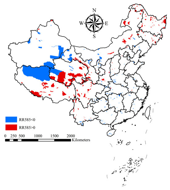 Logarithmic response ratios of alien woody plants in China’s national nature reserves under the SSP585 climate scenario (RR > 0 represents an elevated risk of future intrusion, RR < 0 represents a reduced risk of future intrusion).
