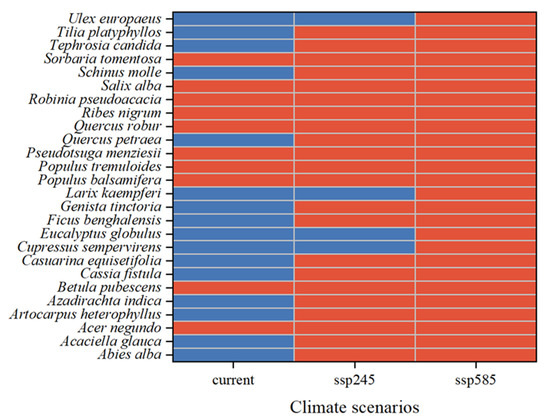 Alien woody plant species identified as high-risk in China’s National Nature Reserves under current and future climate scenarios (current, SSP245, SSP585). Red indicates species whose invasion probability in national nature reserves is at least 10% higher than the overall average across reserves. Blue indicates species with invasion probability in potential national parks ≤10% higher than in national nature reserves.