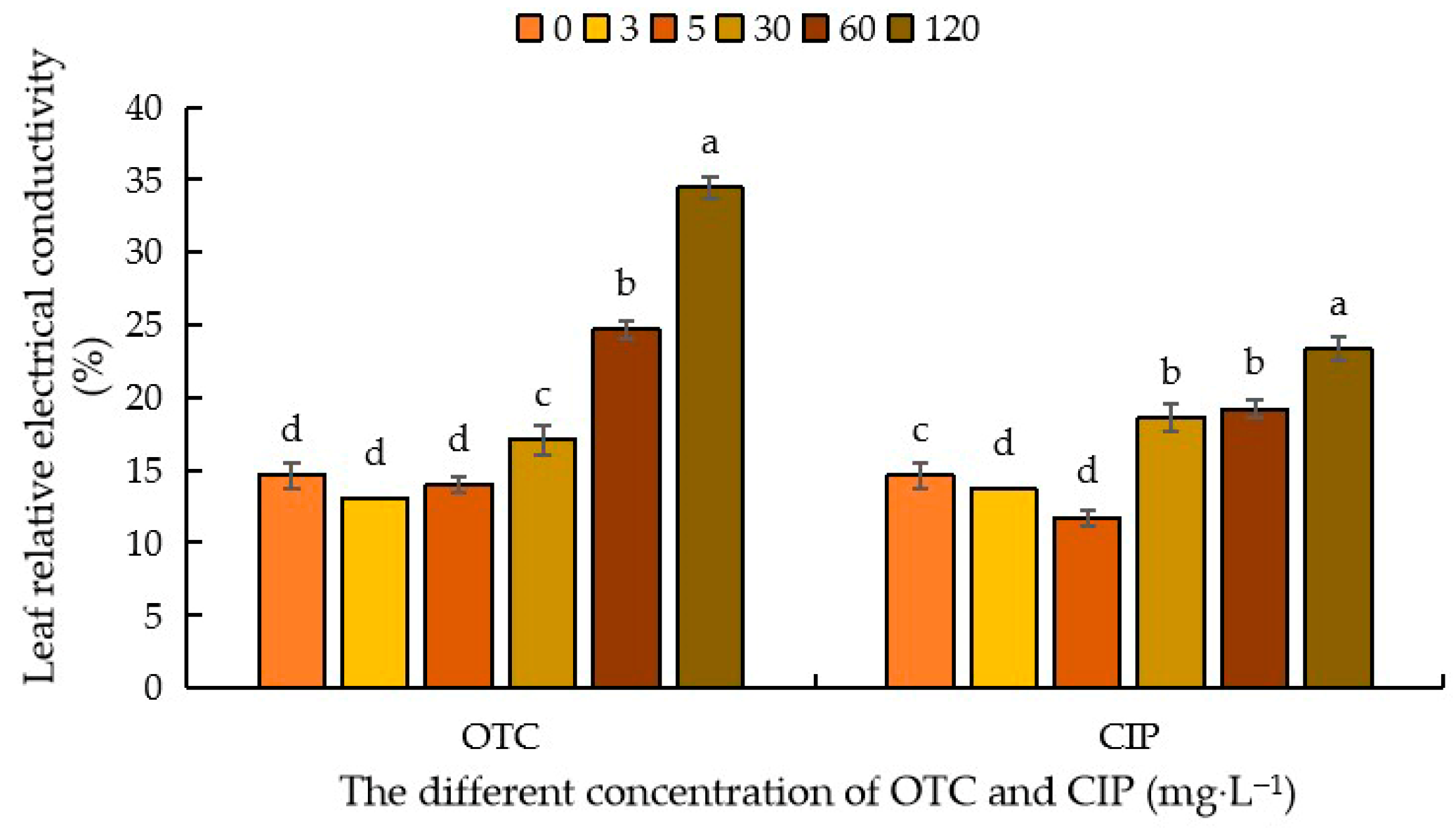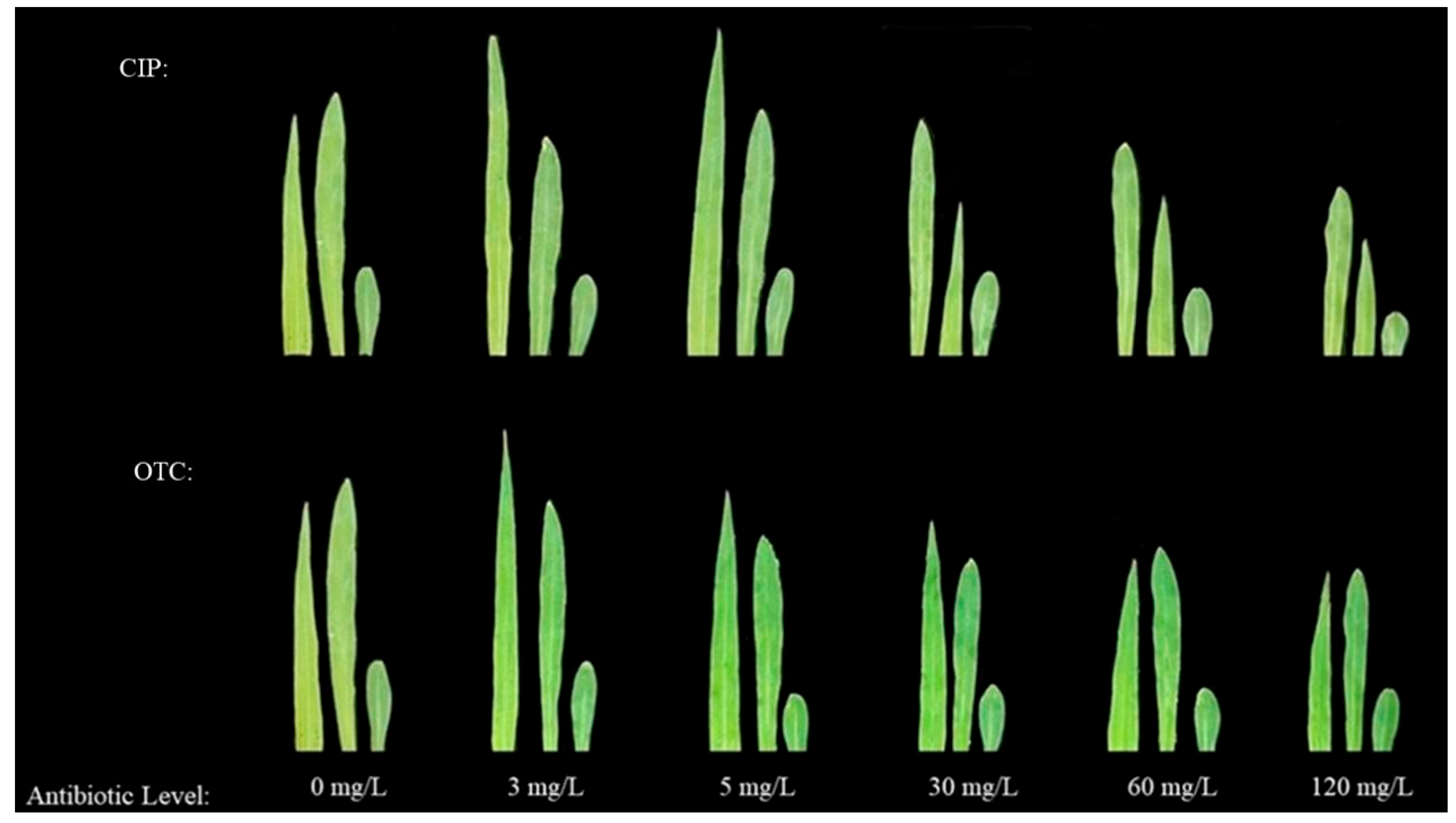 - Antibiotic Treatment: we select uniformly grown seedlings and divide them into 11 treatment groups—Control group: 1/2 Hoagland nutrient solution, forming 1 control group; Treatment groups—Mix CIP and OTC at concentrations of 3, 5, 30, 60, and 120 mg·L−1 into 1/2 Hoagland nutrient solution, forming 10 treatment groups.