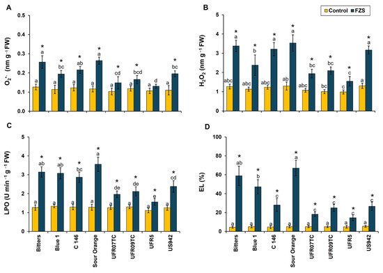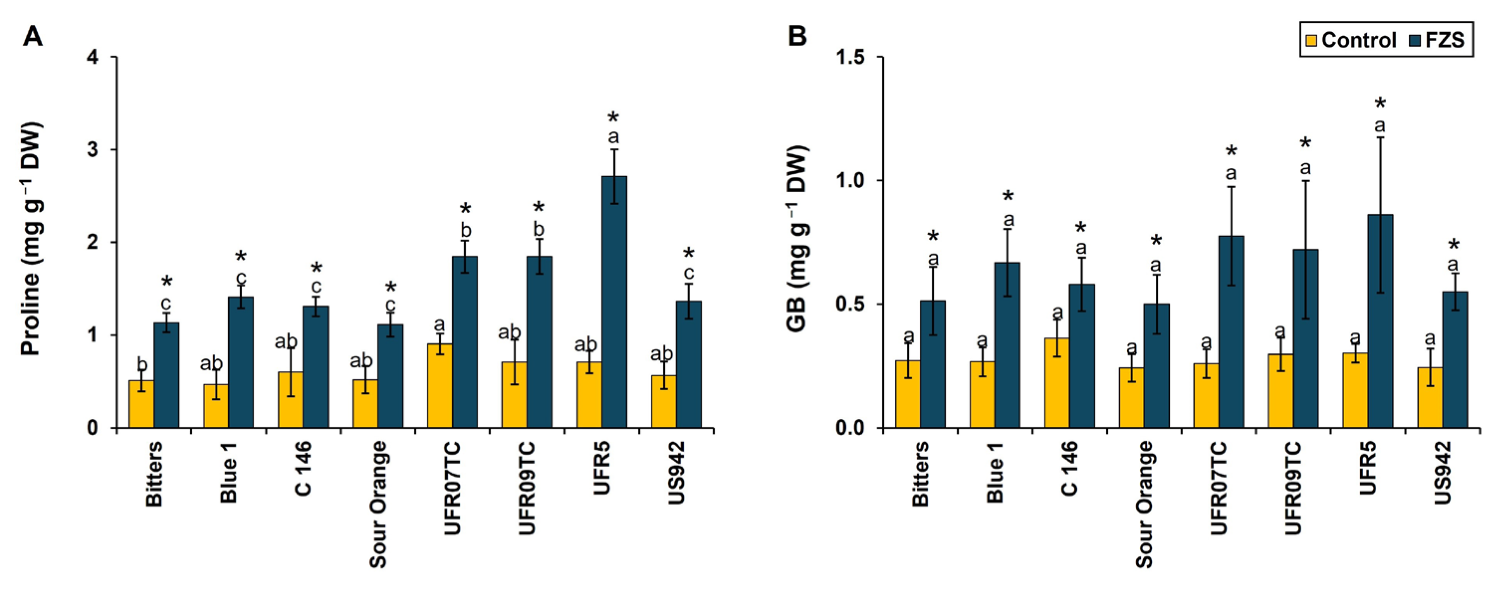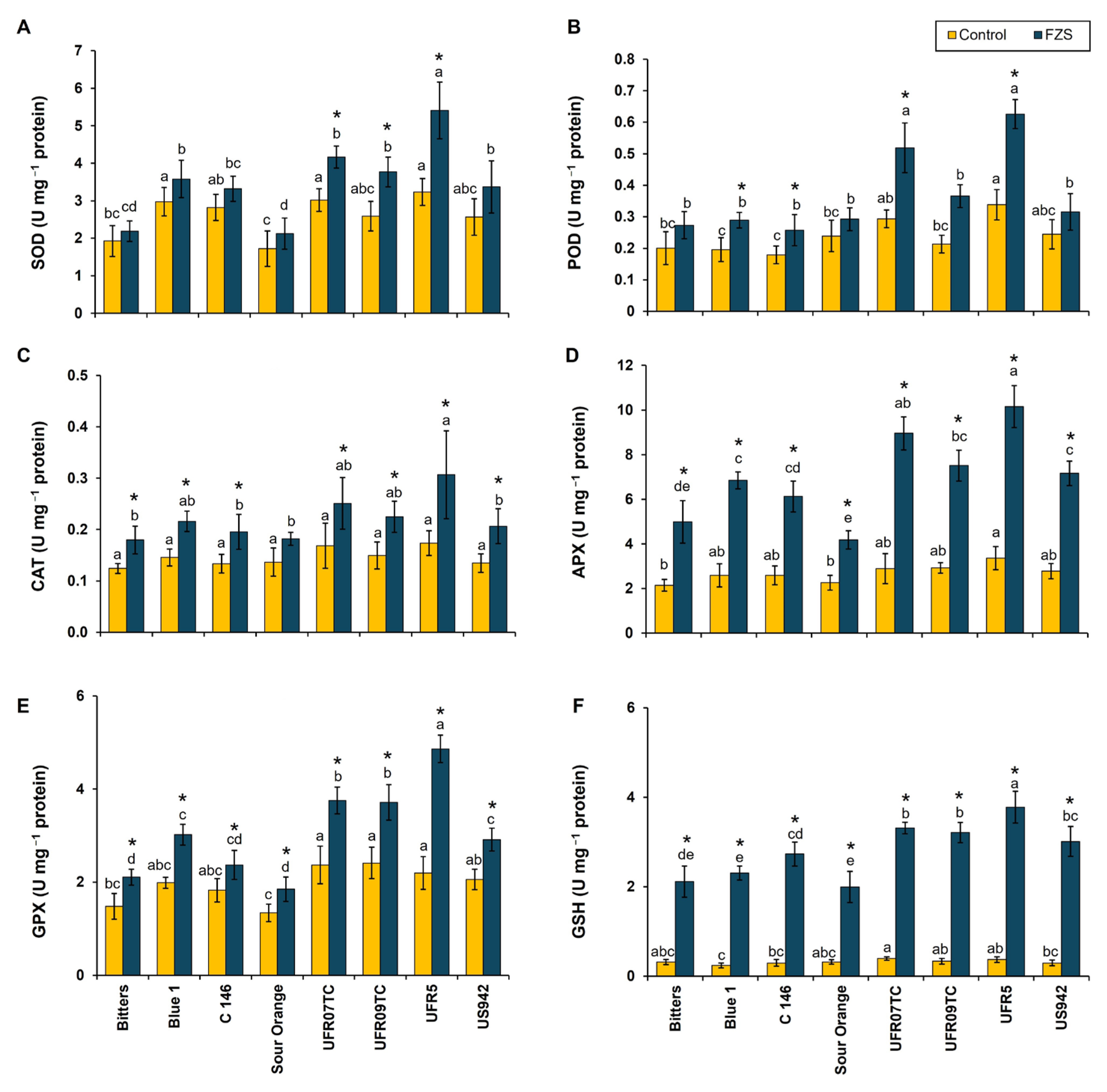 - Balfagón, D.; Terán, F.; de Oliveira, T.d.R.; Santa-Catarina, C.; Gómez-Cadenas, A. Citrus rootstocks modify scion antioxidant system under drought and heat stress combination. Plant Cell Rep. 2022, 41, 593–602. [Google Scholar] [CrossRef] [PubMed]