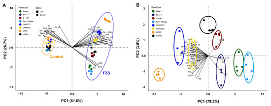 - Primo-Capella, A.; Forner-Giner, M.Á.; Martínez-Cuenca, M.-R.; Terol, J. Comparative transcriptomic analyses of citrus cold-resistant vs. sensitive rootstocks might suggest a relevant role of ABA signaling in triggering cold scion adaption. BMC Plant Biol. 2022, 22, 209. [Google Scholar] [CrossRef]