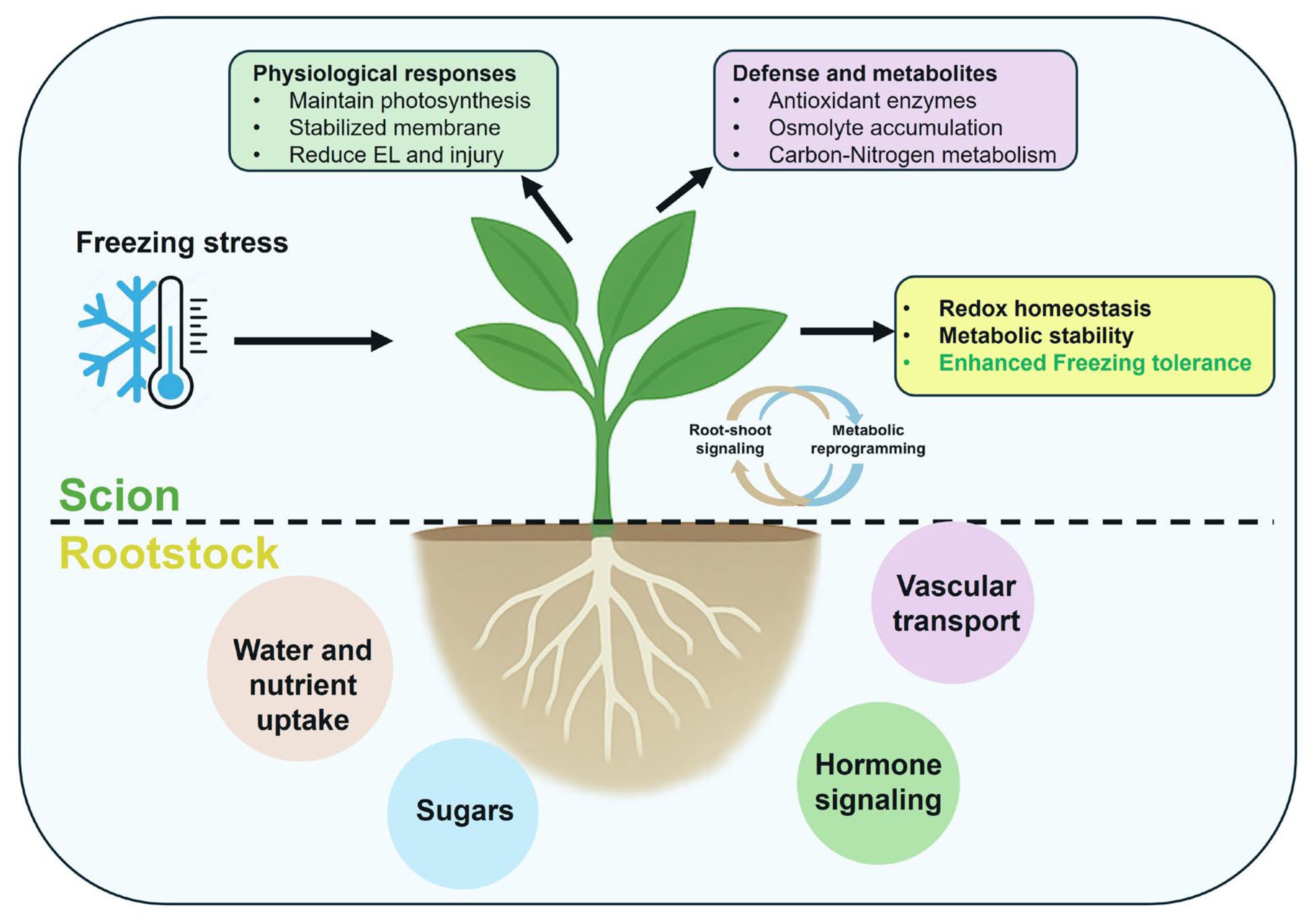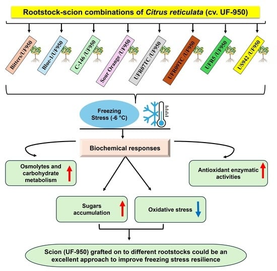 Asif, A.; Iqbal, S.; Aucique-Perez, C.E.; Leaks, K.; Balal, R.M.; Mattia, M.; Chater, J.M.; Shahid, M.A. Scion–Rootstock Interactions Enhance Freezing Stress Resilience in Citrus reticulata Through Integrated Antioxidant Defense and Carbon–Nitrogen Metabolic Adjustments. Plants 2025, 14, 3029. https://doi.org/10.3390/plants14193029