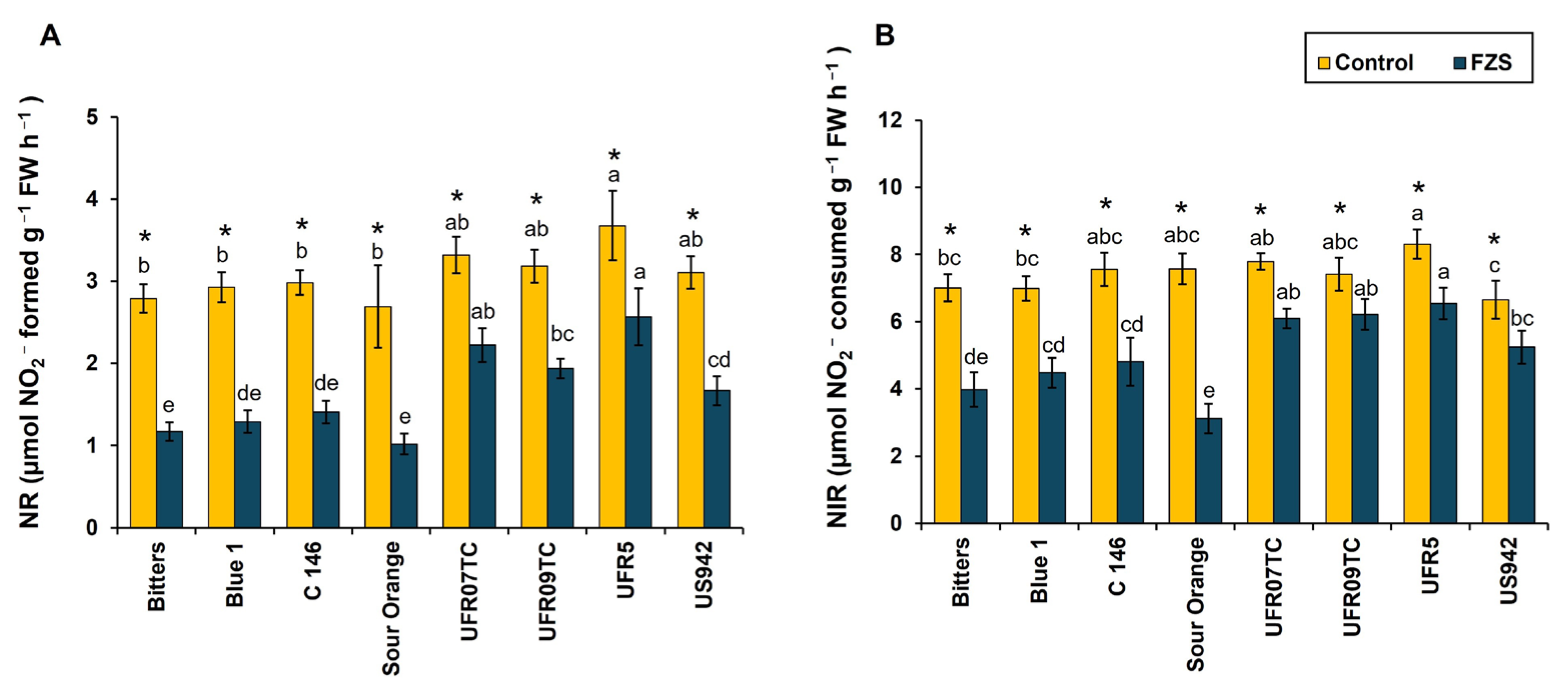 Sour Orange | 13.6 d | 20.3 d* | 4.5 abc | 10.2 e* | 4.9 a | 9.0 e* | 212 a * | 116 e | 38.2 a | 109 e* |