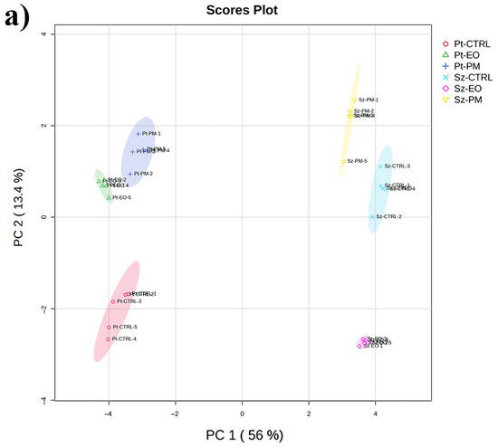 Multivariate principal component analysis (PCA) of the metabolic profiles of the adult stage of Prostephanus truncatus (Pt) and Sitophilus zeamais (Sz) treated with Commiphora myrrha essential oil (EO), the insecticide pirimiphos-methyl (PM) and control (CTRL). (a) PCA scores plot displaying the separation of metabolic profiles across the six experimental groups. (b) The PCA loadings plot illustrates the contribution of individual metabolites to the separation observed in the scores plot. Metabolites further from the origin have a stronger impact on group differentiation. N = 5.