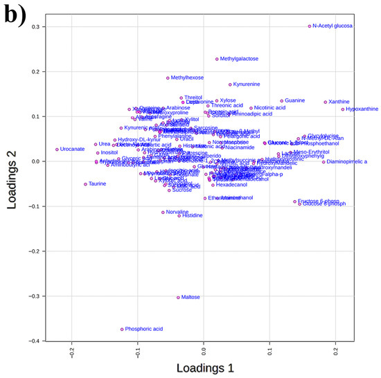 The PCA revealed that species identity dominated variation, with PC1 explaining 56% of the total variance and clearly segregating P. truncatus (negative PC1 values) from S. zeamais (positive PC1 values), while PC2 (13.4% of variance) captured treatment effects within each species, placing untreated P. truncatus at low PC2 values and untreated S. zeamais at moderately higher values, shifting P. truncatus slightly upward and S. zeamais sharply downward under C. myrrha EO exposure and moving both species toward positive PC2 under organophosphate (PM) treatment, with a larger shift in S. zeamais (Figure 1a). The loading plot showed that metabolites with strongly positive PC1 loadings comprised sugar derivatives and nucleotide bases, N-acetylglucosamine, xanthine, hypoxanthine, glucose-6-phosphate, fructose-6-phosphate, whereas small organic acids and certain amino acids such as taurine, urocanate and phosphoric acid carried strongly negative PC1 loadings; PC2 separated methylated or unusual carbohydrates (methylgalactose, methylhexose, threitol) with positive loadings from canonical sugar phosphates and disaccharides (maltose, phosphoric acid) with negative loadings, with a central cluster of moderate-loading amino acids, organic acids and simple sugars lying between these extremes (Figure 1b, Table S1).