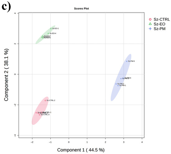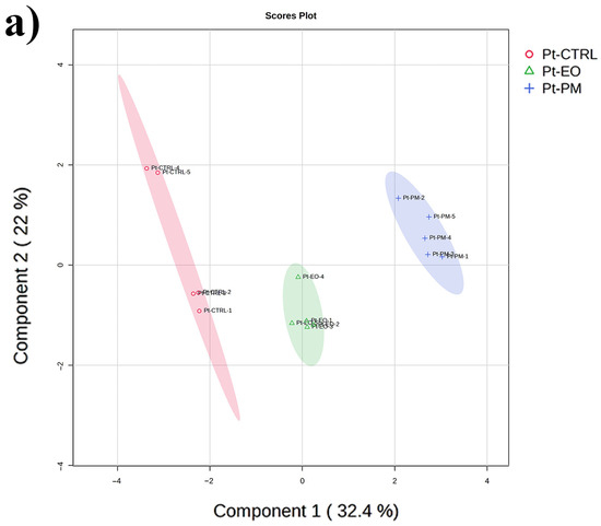 Metabolomic analyses were carried out under a completely randomized layout with five biological replicates per treatment. Raw intensity values from MS-DIAL were first normalized to the ribitol internal standard, then Log10-transformed and Pareto-scaled using MetaboAnalyst 6.0. To explore the overall data structure without prior group assignment, we applied unsupervised principal component analysis (PCA). We then used supervised partial least-squares discriminant analysis (PLS-DA) to focus on metabolites that best separate our control, EO and PM groups. In both PCA and PLS-DA score plots, the Hotelling’s T2 ellipse denotes the 95% confidence region. In PLS-DA analysis, metabolites with a VIP (variable importance in projection) score greater than 1 were flagged as key discriminators. To guard against overfitting, we performed a 20-permutation test, accepting the model only if permuted Q2 and R2Y values remained below 0.05 and trended toward unity. Next, we calculated pairwise partial correlations among metabolites using the debiased sparse partial correlation (DSPC) method (betweenness filter cutoff = 1), which uncovers direct relationships between metabolite pairs while accounting for indirect links. We also conducted one-way ANOVA on each feature (p ≤ 0.05), correcting for multiple comparisons via the False Discovery Rate (FDR ≤ 0.05), to identify those metabolites whose levels change significantly with treatment. The top 60 metabolites resulting from the ANOVA analysis are graphically reported in the text as a heatmap, whereas the full list of significantly altered metabolites is reported in the Supplementary Table S1.