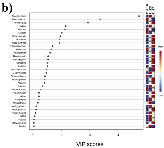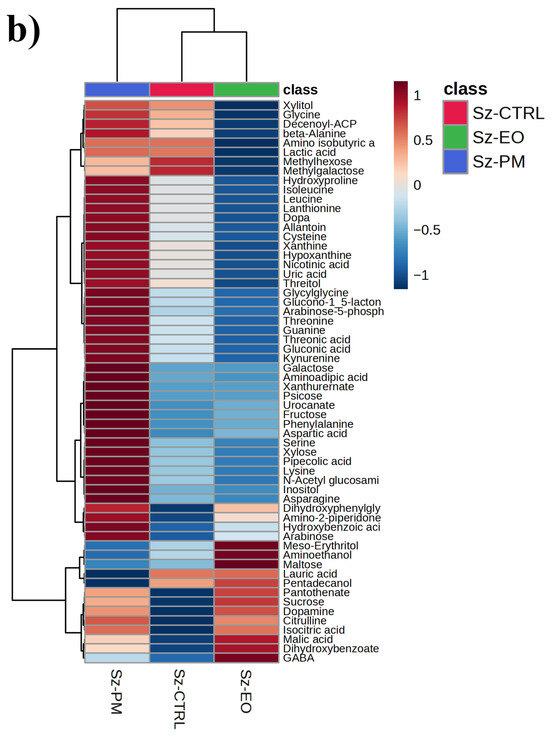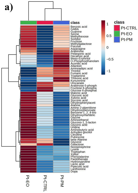 After PCA and PLS-DA, we applied a one-way ANOVA across all features to identify the top 60 metabolites most significantly altered by treatment and visualized their relative abundances in heatmaps (the full list of metabolites significantly affected is reported in Table S1). In P. truncatus (Figure 3a), samples segregate cleanly by treatment, controls cluster together, while C. myrrha EO- and PM-exposed insects form distinct branches, reflecting three metabolite modules: one comprising sugars, sugar alcohols, phosphorylated intermediates and certain amino acid derivatives that are low in controls but strongly up-regulated under EO (intense “hot” coloration in EO columns); a second of organic acids, nucleobase catabolites and a subset of amino acids elevated specifically under PM; and a central set of metabolites suppressed by both treatments relative to controls, indicating a shared stress response. These patterns, treatment-specific up-regulation of largely non-overlapping metabolite sets alongside a common down-regulated core, complement the multivariate findings by highlighting the distinct biochemical pathways mobilized by botanical versus synthetic insecticides. In S. zeamais (Figure 3b), the 60 ANOVA-selected metabolites are similarly partitioned into three categories: those that are markedly elevated only under EO, those that rise specifically with PM exposure, and a group that is consistently suppressed under EO.