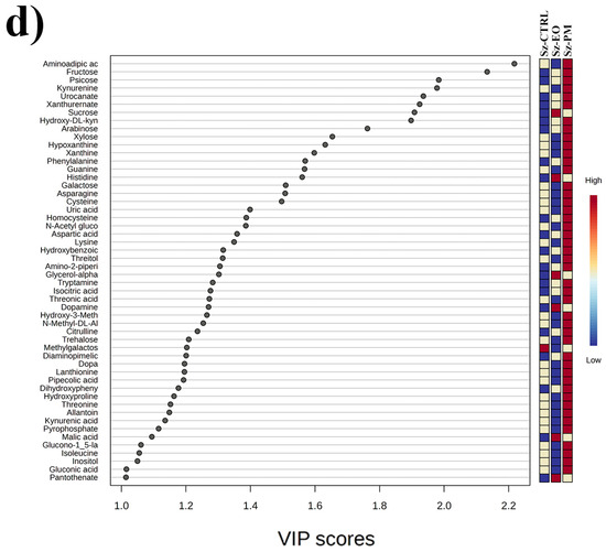 The extensive shifts in primary carbon and nitrogen metabolism observed in EO-treated P. truncatus underscore how disruption of these fundamental pathways can undermine insect physiology. Nitrogen, a core component of proteins, nucleic acids, and other macromolecules, is indispensable not only for cellular structure but also for energy production and immune, reproductive, and stress-response functions [47,48,49,50,51,52,53]. Likewise, central carbon metabolites, glucose 6 phosphate among them, mediate the allocation of resources under nutrient fluctuation, enabling organisms to maintain vital functions when challenged [54,55]. The prominence of both sugar phosphates and amino acid derivatives such as kynurenic acid among VIP > 1 metabolites thus reflects targeted disturbances to carbon and nitrogen flux under EO stress.