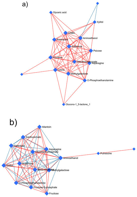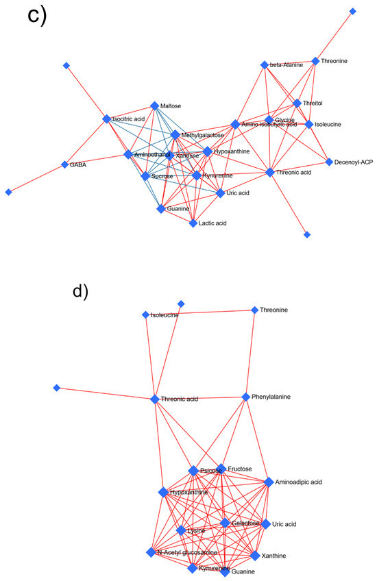 Correlation network obtained by the DSPC algorithm using the metabolites identified in the adult stage of Prostephanus truncatus treated with (a) Commiphora myrrha essential oil and (b) pirimiphos-methyl, and those identified in Sitophilus zeamais also treated with (c) Commiphora myrrha essential oil and (d) pirimiphos-methyl. Blue nodes represent metabolites, red lines indicate a positive correlation between metabolites, and blue lines indicate a negative correlation. N = 5.
