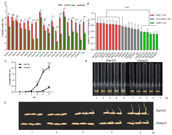From the above experiments, the varieties Xian133 and Chang15 were selected for further phenotypic comparison. Coleoptile lengths were measured on 1, 2, 3, 4, and 5 d after cultivation, and statistical comparisons were conducted to assess the significance of differences between the two varieties.