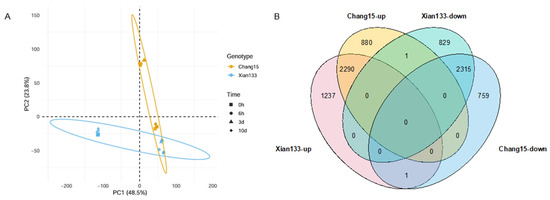 Transcriptomic overview and differential-expression dynamics. (A) PCA shows PC1 separates cultivars and PC2 follows the temporal gradient of submergence. (B) Venn diagrams illustrate the number and overlap of “persistently responsive” genes (consistently up- or down-regulated across all pairwise comparisons) in Xian133 and Chang15.