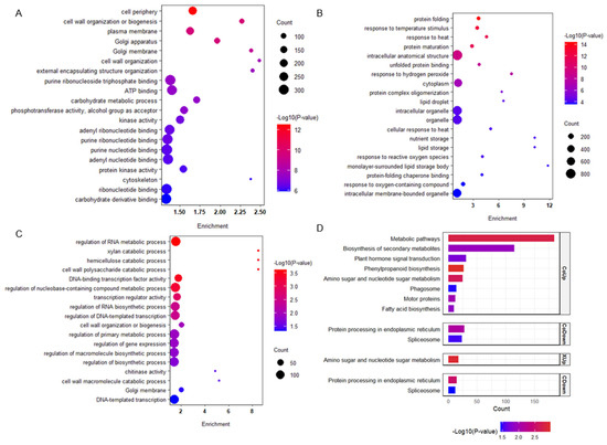 To dissect the contribution of genotypespecific transcriptional reprogramming to the divergent elongation of coleoptiles under submergence, we performed GO and KEGG enrichment analyses on distinct gene sets. GO enrichment revealed that genes commonly up-regulated in both Xian133 and Chang15 were significantly enriched in cellular periphery (e.g., cell periphery, plasma membrane), cell-wall biogenesis and remodeling (cell wall organization or biogenesis, Golgi apparatus, Golgi membrane), as well as ATP-binding processes (Figure 3A). By contrast, commonly down-regulated genes were over-represented in protein folding and processing (protein folding, unfolded protein binding, protein maturation) and stress-responsive functions (response to temperature stimulus, response to heat) (Figure 3B).