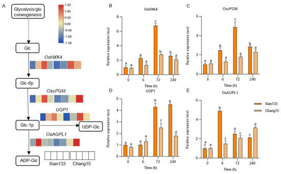The key genes involved in UDP-Glc and ADP-Glc biosynthesis (sub-pathway M00549), namely OsHXK4 (Os07g0197100), OscPGM (Os03g0735000), UGP1 (Os09g0553200), and OsAGPL1 (Os03g0735000), were analyzed on their expression dynamics at 0, 6, 72, and 240 h post-submergence.