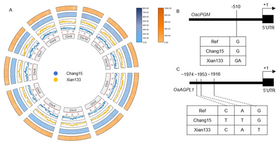 Genome-wide polymorphism landscape and promoter divergence of UDP-Glc and ADP-Glc biosynthesis pathways genes. (A) Circos visualization of variants between Xian133 and Chang15. Tracks from outermost to innermost: indel heat-maps (outer, Xian133; inner, Chang15) and SNP density line plots (outer, Xian133; inner, Chang15); centermost ring indicates the 12 chromosomes. A total of 5,590,317 SNPs and 931,335 indels were identified, 45.04% of SNPs and 43.08% of indels being cultivar-specific. (B) Detailed view of promoter SNPs in OscPGM. (C) Detailed view of promoter SNPs in OsAGPL1. Promoter regions were defined as the 2 Kb sequence immediately upstream of the transcription start site.