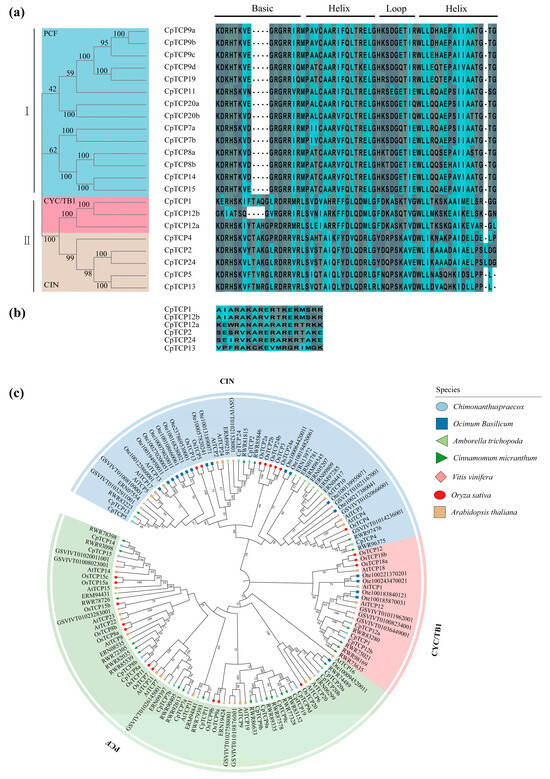 Conserved domain and evolutionary analysis of CpTCP proteins. (a) Multiple sequence alignment of CpTCP proteins. (b) Alignment of R domains in type II subfamily members. (c) Phylogenetic analysis of TCP proteins from Chimonanthus praecox, Arabidopsis thaliana, Oryza sativa, Ocimum basilicum, Vitis vinifera, Cinnamomum micranthum, and Amborella trichopoda. The phylogenetic tree was constructed using the neighbor-joining method, with 1000 bootstrap replicates, using MEGA (version 10.0).