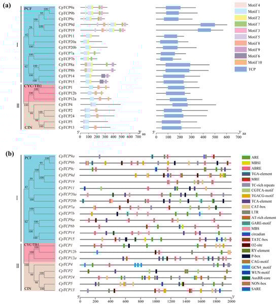 Analysis of conserved motifs and promoter cis-acting elements of CpTCPs. (a) Conserved motifs and domains. Motifs 1–10 are represented by differently colored boxes, and the box length represents the motif length. The conserved TCP domain is indicated by a blue box. (b) Analysis of cis-acting elements in the CpTCP promoter.