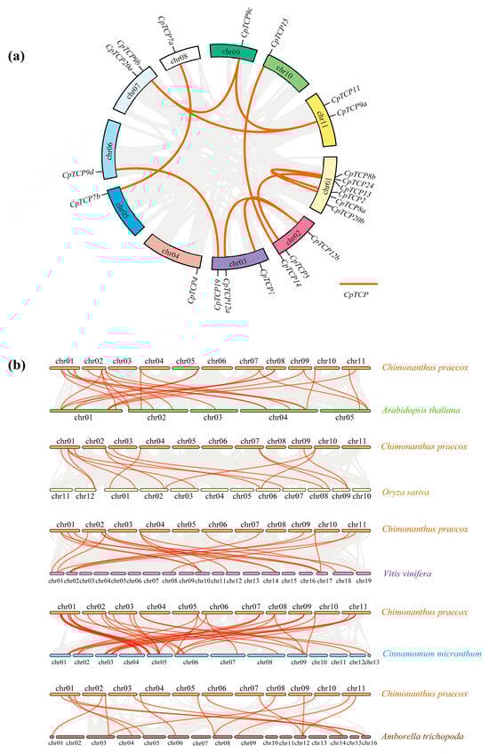 Gene localization analysis showed that CpTCP genes were distributed across all chromosomes (Figure 3a). Moreover, synteny analysis of C. praecox, A. thaliana, O. sativa, V. vinifera, Cinnamomum micranthum, and Amborella trichopoda revealed replication events for all coding genes. Eleven pairs of syntenic genes were identified in the C. praecox TCP family: CpTCP8a/8b, CpTCP2/24, CpTCP5/13, CpTCP1/12b, CpTCP12a/12b, CpTCP14/15, CpTCP9d/19, CpTCP7a/7b, CpTCP9a/9b, CpTCP9b/9c, and CpTCP9a/9c. Synteny genes were found on all chromosomes except chromosome 04. Further, C. praecox shared 24, 14, 19, 39, and 16 syntenic gene pairs with A. thaliana, O. sativa, V. vinifera, Cinnamomum micranthum, and Amborella trichopoda, respectively (Figure 3b), indicating a close evolutionary relationship with dicots, particularly of the Lauraceae family. Further analysis showed that CpTCP2, CpTCP4, CpTCP9b, CpTCP9c, CpTCP14, CpTCP15, CpTCP20b, and CpTCP24 exhibit synteny across the five species, suggesting that these genes appeared before the divergence of monocots and dicots and maintained high conservation. Conversely, CpTCP7b and CpTCP20a were not detected in the synteny analysis, indicating that they may be unique to C. praecox or may have emerged at later evolutionary stages.