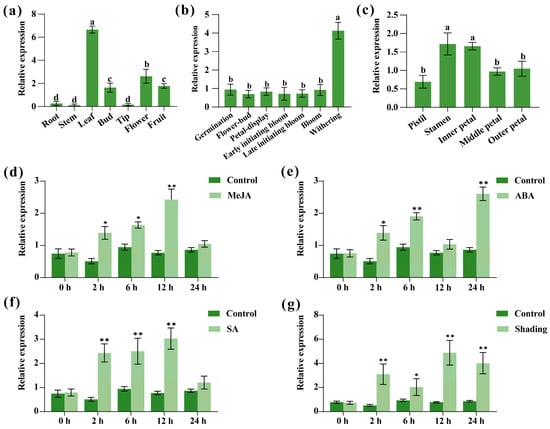 Analysis of the sequence characteristics of CpTCP2. Relative expression of CpTCP2 in the different tissues (a), flowering stages (b), and floral organs (c) of Chimonanthus praecox. Different lowercase letters indicate significant differences (p < 0.05). Relative expression of CpTCP2 in response to 100 μmol/L methyl jasmonate (MeJA) (d), 50 μmol/L abscisic acid (ABA) (e), 50 μmol/L salicylic acid (SA) (f), and shading treatment (g) in wintersweet leaves. Control refers to leaves collected from untreated wintersweet plants. Asterisks denote statistically significant differences compared with control, * p < 0.05, ** p < 0.01. The data of each group are presented as the mean ± standard deviation.