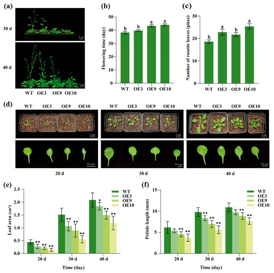 To investigate the functional role of CpTCP2, CpTCP2-overexpressing transgenic Arabidopsis plants were generated by transforming the pCAMBIA1300 vector containing the 35S promoter. Three overexpression lines with low, medium, and high CpTCP2 expression levels (OE3, OE9, and OE10, respectively) were selected (Figure S1). Phenotypic observations of the T3 generation (Figure 5a) revealed that the OE9 and OE10 lines exhibited significantly delayed flowering compared to the WT, with the differences being statistically significant (Figure 5b). Additionally, the CpTCP2 overexpression lines produced more rosette leaves than the WT in Arabidopsis. (Figure 5c). Measurements of the leaf areas of T3-generation CpTCP2-overexpressing lines and the WT showed that those in the OE3, OE9, and OE10 lines were smaller than those of the WT at 20, 30 and 40 days post-sowing, with OE10 having the smallest leaf area (Figure 5d,e). Moreover, the petioles of overexpressing lines were shorter than those of the WT plants (Figure 5f).