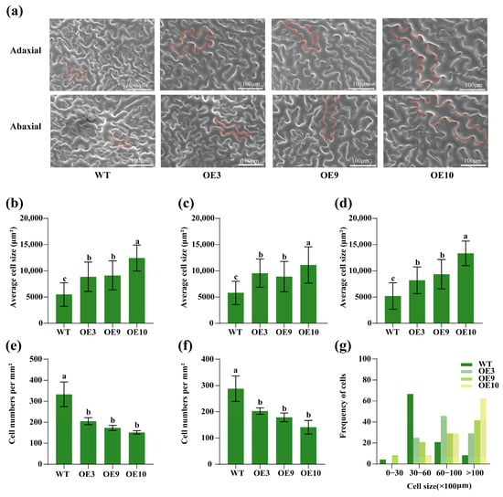 Scanning electron microscopy of the sixth leaf epidermal cells revealed that the average cell area and the cell area of both the adaxial and abaxial surfaces were significantly larger in the OE lines compared to those in the WT, with OE10 exhibiting the largest cell area (Figure 6a–d). Additionally, epidermal cell numbers in the leaves of the OE3, OE9, and OE10 lines were significantly reduced compared with the WT, with OE10 exhibiting the lowest level. Further, more than 60% of the cells in the OE10 line had an area greater than 10,000 μm2 (Figure 6e–g).
