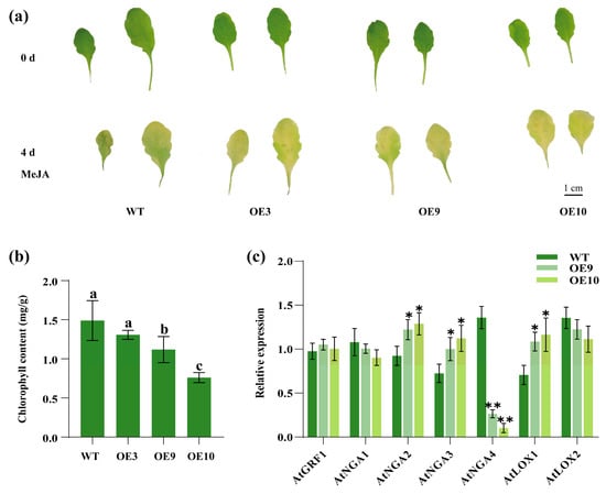 To further explore the regulatory relationship between MeJA and CpTCP2, the leaves from Arabidopsis plants overexpressing CpTCP2 were treated with 100 μmol/L MeJA for 4 days (Figure 7a). Both WT and OE lines (OE3, OE9, and OE10) exhibited leaf chlorosis after 4 days of MeJA treatment, with the OE lines showing more pronounced chlorosis compared with WT, and their chlorophyll content was significantly reduced (Figure 7a,b), indicating that CpTCP2 positively regulates MeJA-induced leaf senescence. To investigate the molecular mechanism through which CpTCP2 regulates leaf growth and senescence in C. praecox, gene expression analysis of the relevant pathways in Arabidopsis OE lines (OE10, OE9) was performed. Compared to that in the WT, the expression of AtNGA2 and AtNGA3 was significantly upregulated in the OE lines, whereas that of AtNGA4 was significantly downregulated, and AtGRF1 and AtNGA1 showed no significant changes (Figure 7c). These findings suggest that CpTCP2 regulates leaf development by modulating NGA family members, promoting the expression of NGA2 and NGA3, and inhibiting NGA4 in Arabidopsis. Furthermore, CpTCP2 may affect JA accumulation by upregulating AtLOX1 expression, thereby regulating leaf senescence in Arabidopsis.