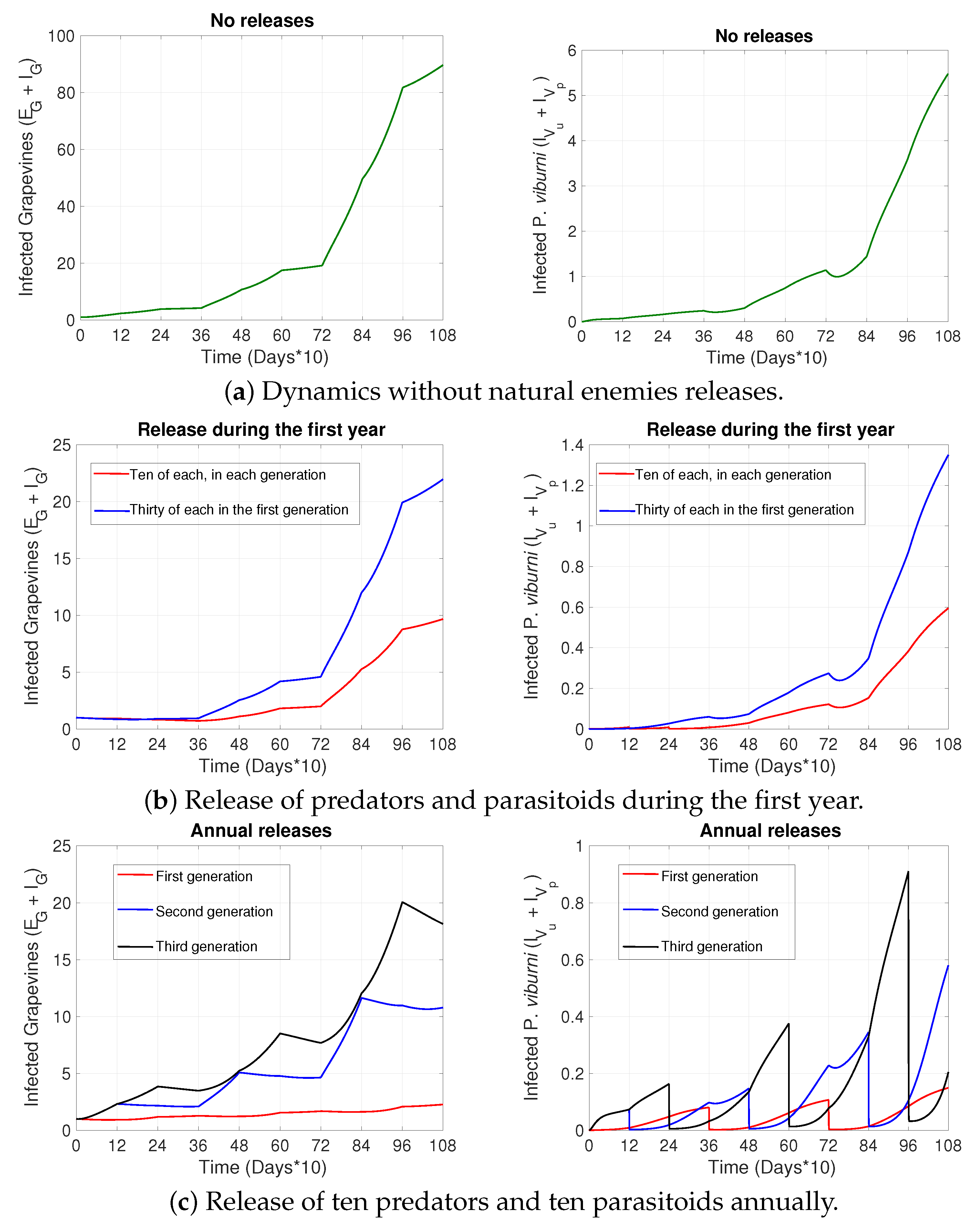 - Correa, M.C.; Gutiérrez-Jara, J.P.; Vogt-Geisse, K.; Benitez, H.; Pérez, L.M.; Fleisch, A.; Malausa, T.; Queguiner, L.; Rodríguez, S.; Ris, N.; et al. Better alone than in bad company? Modeling the intra-guild predation and release timing in the biological control of Pseudococcus viburni. J. Pest Sci. 2024, 97, 1913–1926. [Google Scholar] [CrossRef]