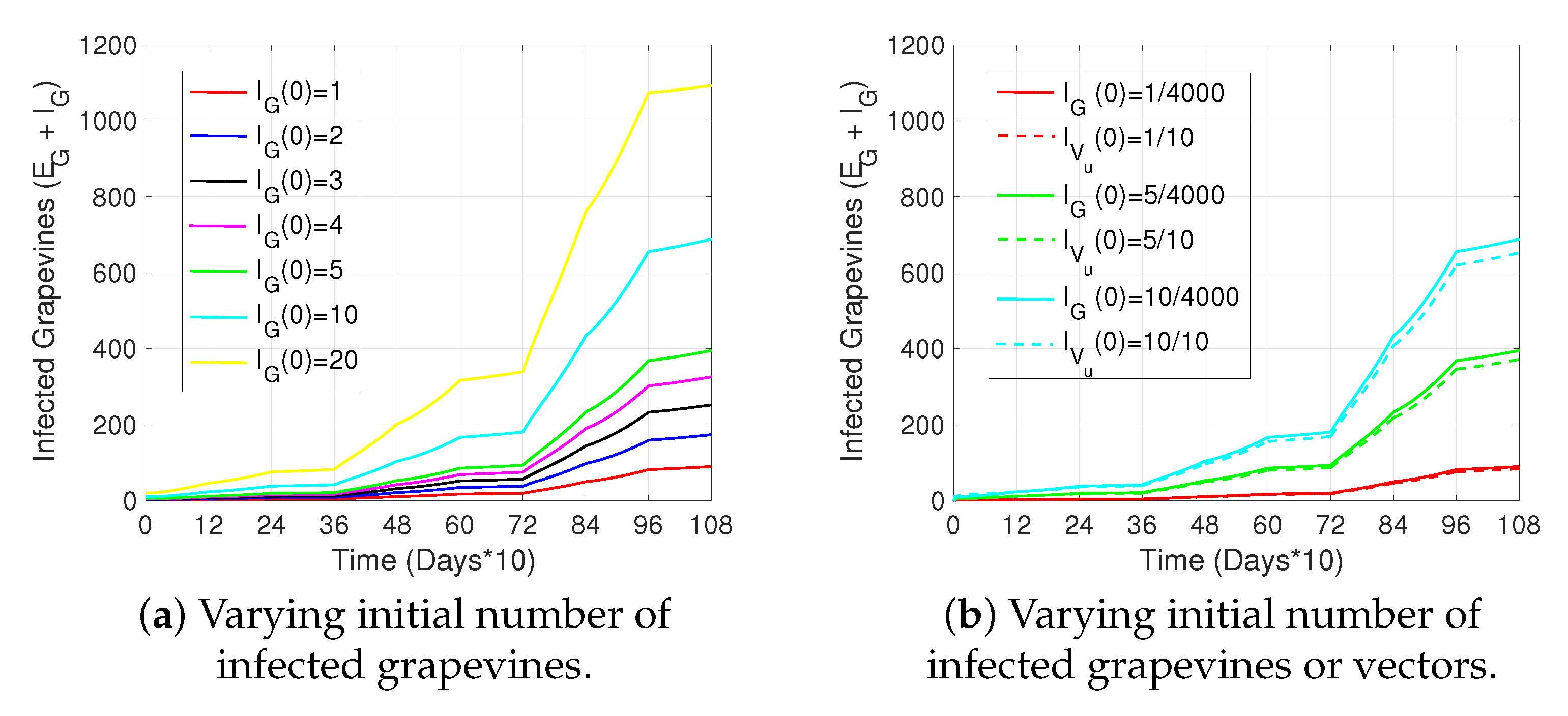 - Jeger, M.; Van den Bosch, F.; Madden, L. Modelling virus-and host-limitation in vectored plant disease epidemics. Virus Res. 2011, 159, 215–222. [Google Scholar] [CrossRef]
