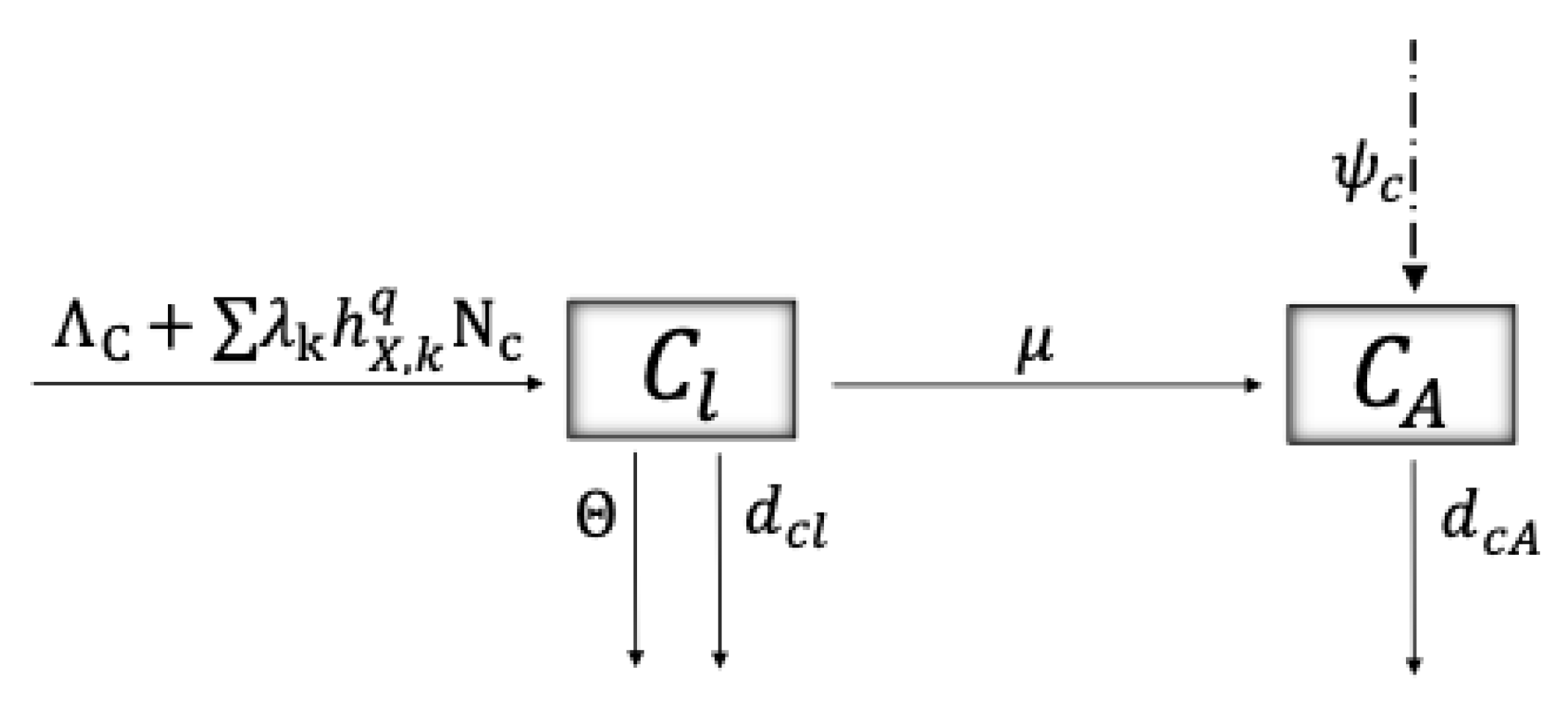 - Gutiérrez-Jara, J.P.; Córdova-Lepe, F.; Muñoz-Quezada, M.T.; Chowell, G. Pesticide application, educational treatment and infectious respiratory diseases: A mechanistic model with two impulsive controls. PLoS ONE 2020, 15, 0243048. [Google Scholar] [CrossRef]