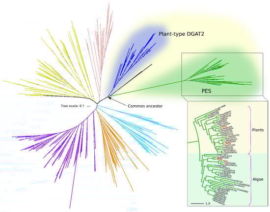 To identify PES homologs in algae, we conducted a HMMER iterative search using A. thaliana PES1 and PES2 as queries against predicted proteomes from algal species and from a set of representative eukaryotes (Table S1). The resulting candidates were then subjected to clustering and phylogenetic analyses, in order to establish their positioning within the superfamily of DAGAT domain-containing proteins (Pfam ID PF03982). Figure 1 shows the phylogenetic relationships of the DAGAT domain, present in DGAT2 and several related proteins, including PES.