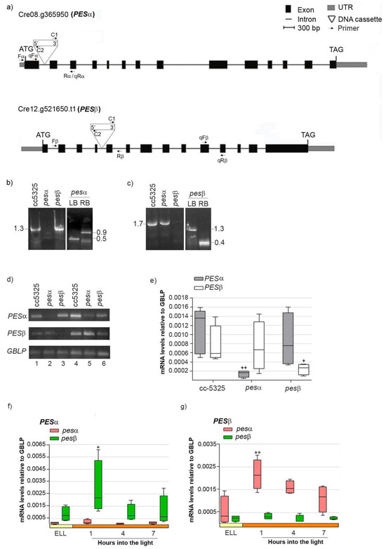 In order to study if PESα and PESβ participate in a light-induced lipid synthesis pathway, we acquired mutants from the Chlamydomonas Library Project (CLiP, https://www.chlamylibrary.org/ (accessed on 4 April 2020)). This is a collection of C. reinhardtii strains generated by random insertion of a 2.2 kb paromomycin-resistance cassette into the cc-5325 strain [30]. We selected the lines LMJ.RY0402.052315 (pesα) and LMJ.RY0402.046050 (pesβ), which contain the DNA cassette inserted in intron 1 and intron 4 of the PESα and PESβ genes, respectively, based on a 95% mapping confidence (Figure 4a) [30].