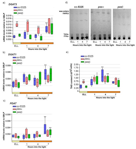 Our previous work demonstrated that high-light conditions upregulate both DGAT3 and DGAT1 mRNA levels while concurrently increasing TAG accumulation in C. reinhardtii [16]. We also proposed a functional role for PDAT in this stress response [16]. Therefore, we analyzed whether the expression pattern of DGAT3, DGAT1 and PDAT, as well as TAG content, were modified in pesα and pesβ strains. Figure 5a–c shows that DGAT3, DGAT1 and PDAT mRNAs were significantly increased in cc-5325, 7 h after shifting cells from low light to high light.
