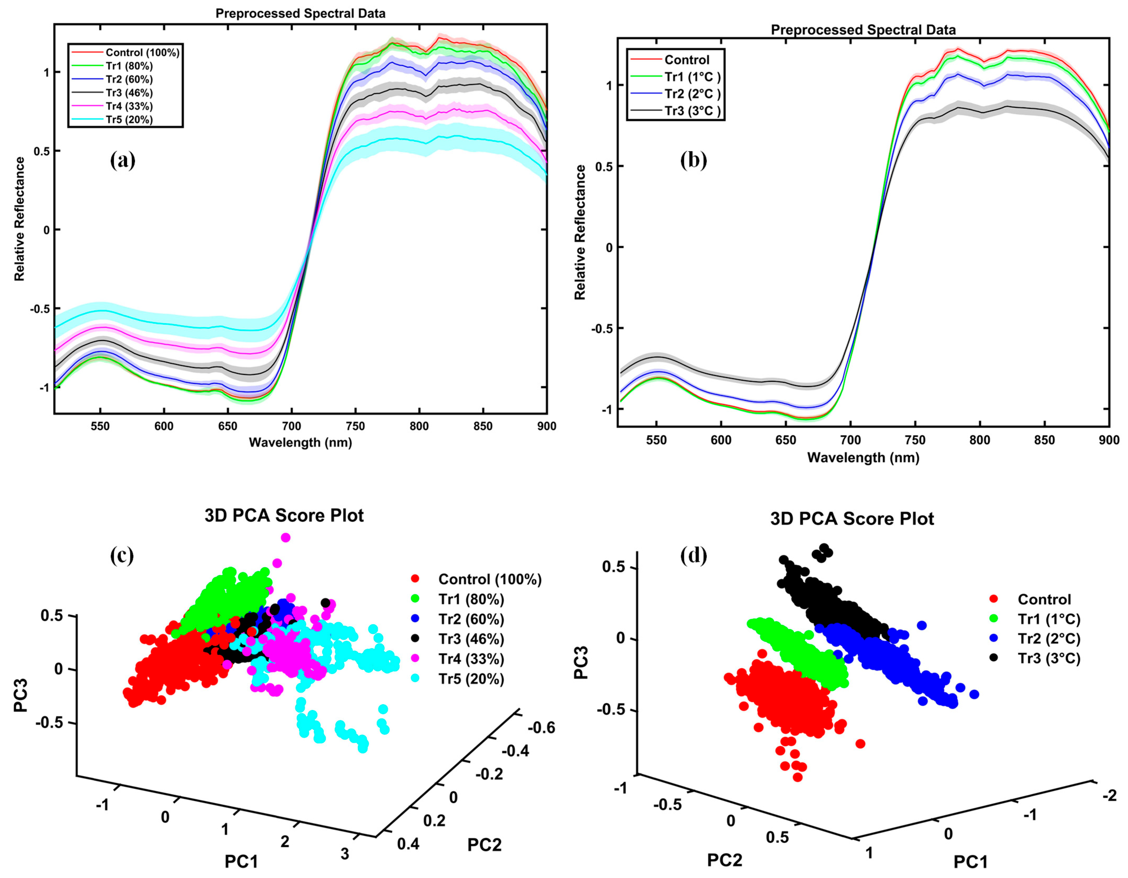 Figure 1 present the distribution of spectral data points using PCA for the drought and temperature stress datasets, respectively. In the drought stress analysis, the first principal component (PC1) captures 85.4% of the total variance, with the second component (PC2) accounting for an additional 5.5%. Together, these two components account for 90.9% of the variance, facilitating a clear separation among different irrigation treatments. Similarly, for temperature stress, PCA reveals distinct clustering of treatment groups relative to the control, with PC1 and PC2 accounting for 53% and 15.9% of the variance, respectively, for a combined total of 68.9%. These visualizations provide intuitive insights into the distribution and separability of the data under various stress conditions.