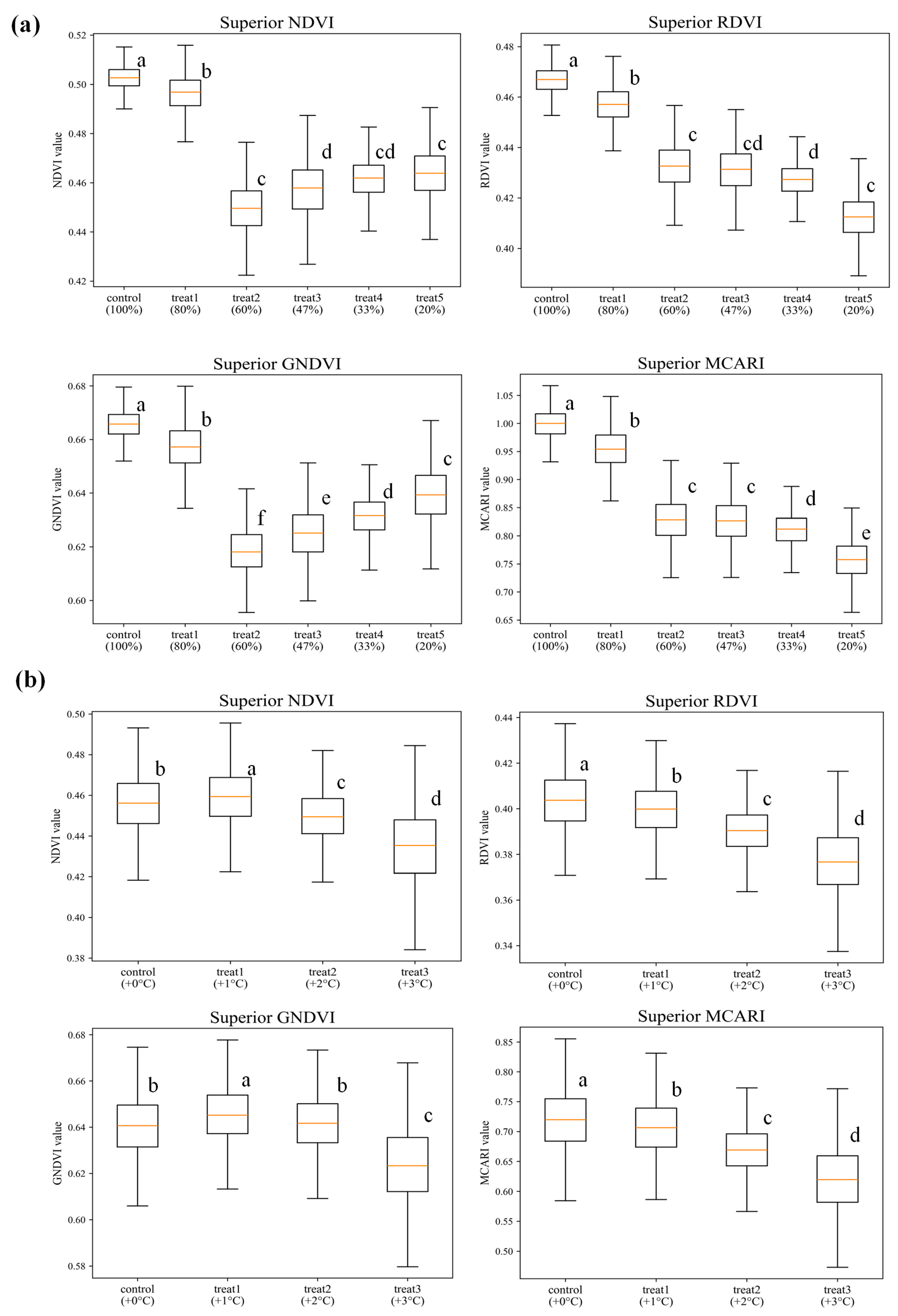 Figure 2a), index values remained stable under control (100%) and moderate (80%) irrigation but declined sharply at 60% and below, effectively marking the onset of severe stress. Notably, this decline provided a more precise boundary than spectral profiles alone, which often made it difficult to distinguish between transitional stages. A slight rebound at more severe irrigation deficits suggested the presence of possible acclimation mechanisms to prolonged drought. Under temperature stress (