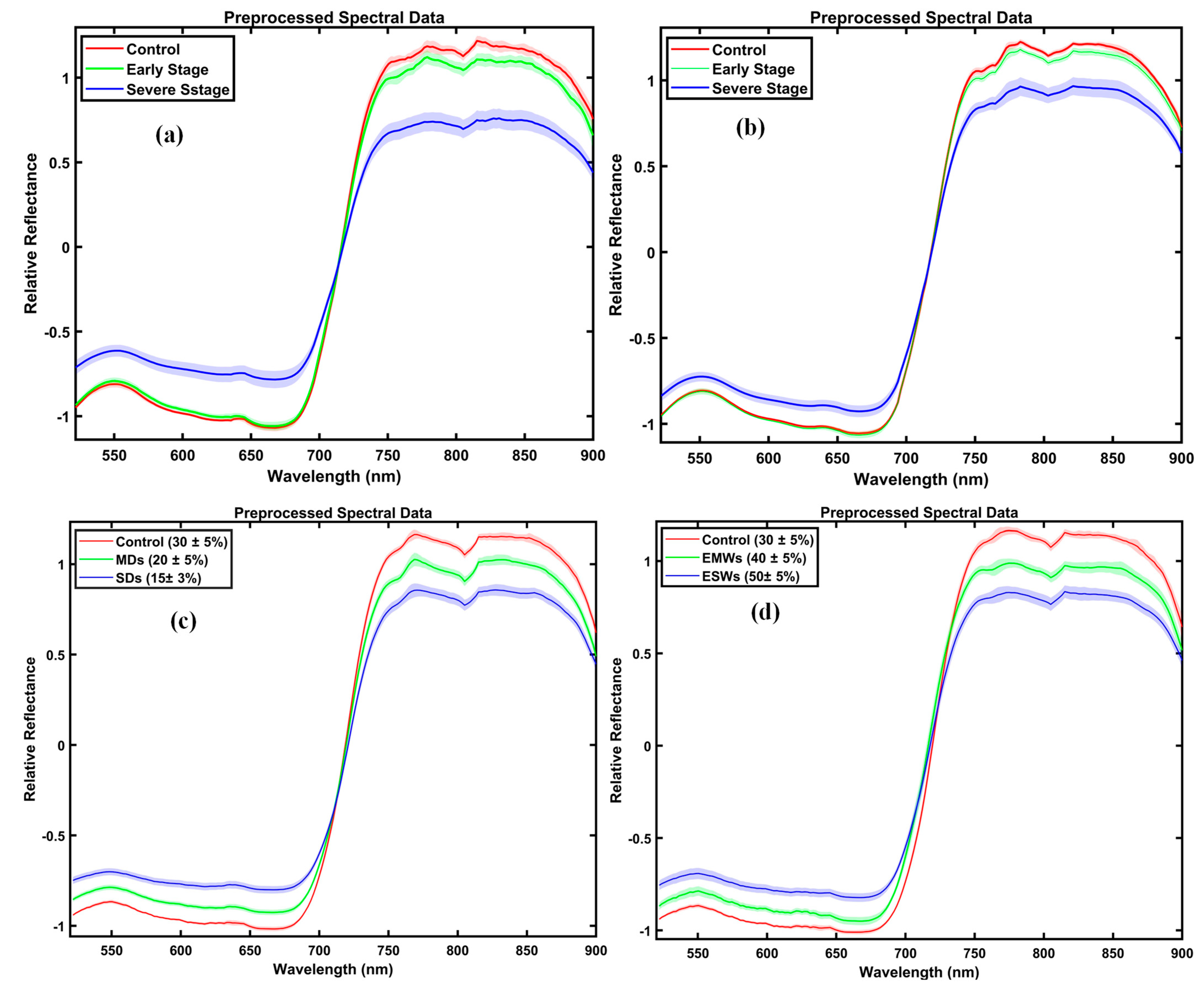 Figure 1 presents the mean spectral reflectance of drought- and temperature-stressed potato plants, preprocessed using the Standard Normal Variate (SNV) method, with shaded regions representing the standard deviations for the control and treated groups. Spectral preprocessing significantly enhanced data consistency by effectively removing unwanted spectral variations caused by baseline shifts, scattering effects, and path-length differences. Panel (a) shows the progressive spectral changes under drought stress, with reflectance decreasing from full irrigation (100%) to severe deficit (20%). Control plants exhibit lower reflectance in the visible range (400–730 nm) compared to plants subjected to 60% or less irrigation, which show elevated reflectance. Conversely, in the near-infrared (NIR) region (730–900 nm), the preprocessed spectral data revealed higher reflectance for healthy plants compared to stressed plants. Panel (b) depicts the effects of temperature stress. Higher temperatures (+2 °C and +3 °C) accelerated the increase in reflectance across both visible and NIR wavelengths. In contrast, control and mildly stressed (+1 °C) plants exhibited nearly identical spectral profiles. In healthy potato leaves, pigments such as chlorophyll and carotenoids efficiently absorb visible light, particularly in the blue (~450 nm) and red (~670 nm) regions, resulting in lower reflectance.