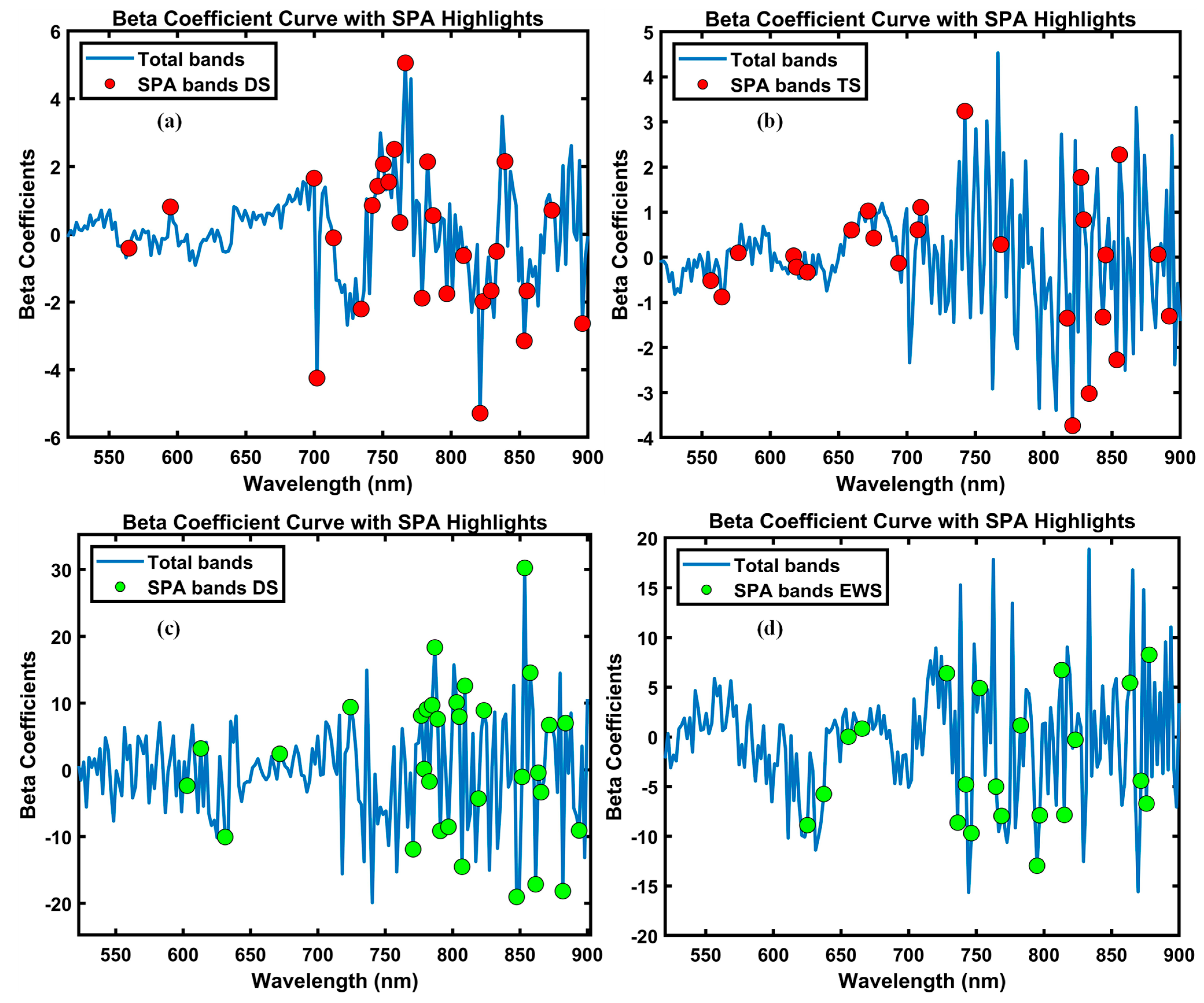 Figure 5 illustrates these beta coefficient profiles of total and selected bands for both potato and sweet potato plants under various abiotic stresses. Panels (a) and (b) present the drought and temperature stress responses in potato cultivars, with SPA-selected bands combined spectral markers indicated by red dots, respectively. Panels (c) and (d) show drought and excessive water stress in sweet potato plants, with selected bands indicated by green dots. Prominent features in the visible region (520–740 nm) are linked to alterations in photosynthetic pigments, with chlorophyll-related signatures evident near 556.5 nm and along the red-edge around 724.2 nm. Moreover, shifts within the red-edge interval (690–740 nm) closely track chlorophyll loss, aligning with previous reports [