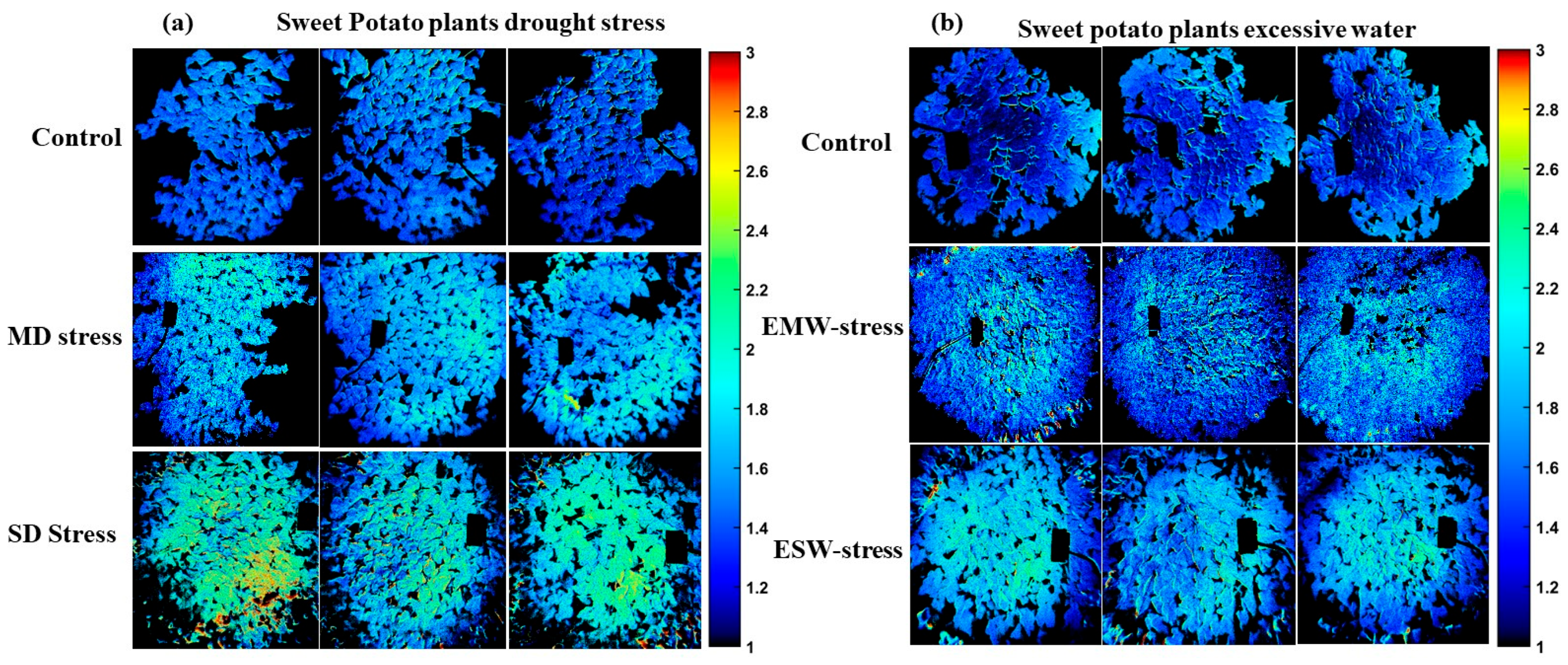 Figure 7 depicts sweet potato plants under drought and excessive water stress. Panel (a) reveals a progressive increase in yellow-green hues from control to moderate (MD) and severe drought (SD) stress, again emphasizing pigment loss and moisture depletion, especially in top leaves. In contrast, panel (b) shows excessive water stress (EMW and ESW), where chemical changes are subtler and more evenly distributed throughout the canopy, likely due to root zone saturation affecting the entire plant. These visualizations confirm that drought stress induces localized, progressive deterioration, whereas excessive water stress causes broader but less intense physiological alterations.