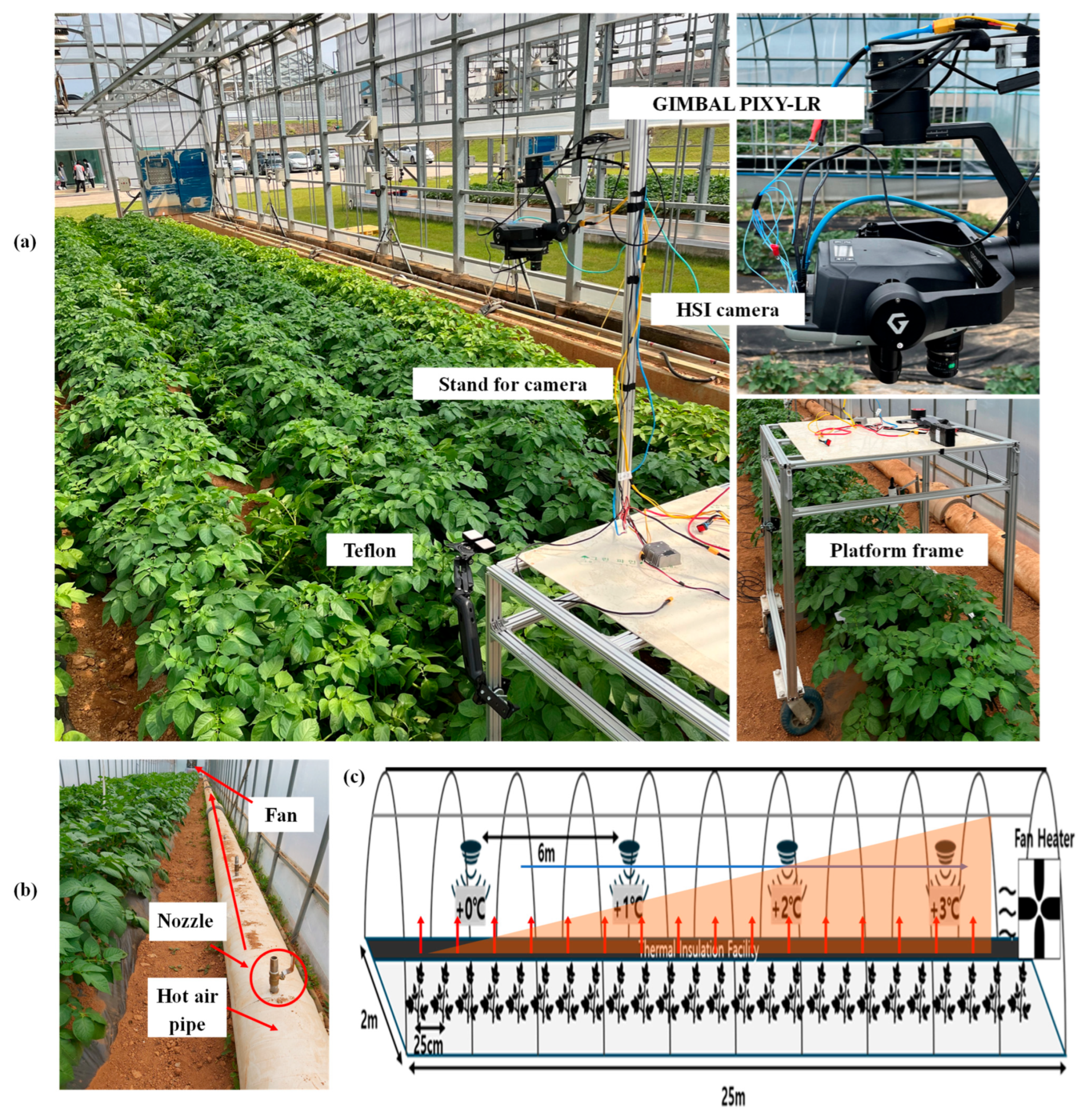 Figure 8 presents a schematic representation of (a) the data acquisition platform used for imaging plants, (b) the greenhouse heating system heating duct and nozzles designed for heat stress treatments, and (c) the specific layout of the greenhouse used to impose heat stress on the plants.