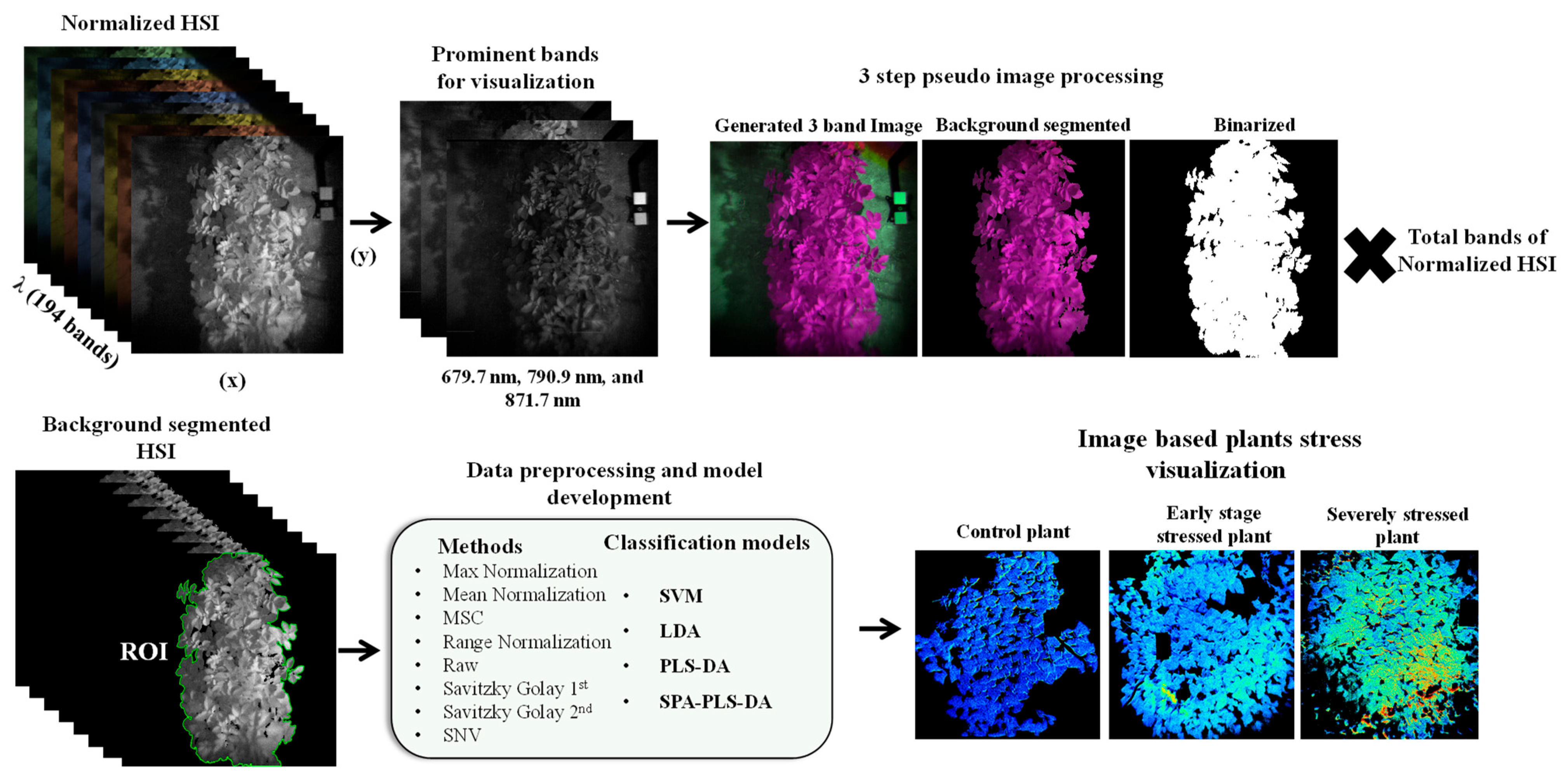 Among the high-performing models based on the SPA, a minimum of selected bands was utilized to generate chemical images, which visualized and distinguished patterns of plant stress. Hyperspectral data were first transformed into a 2D spectral matrix, and the SPA-selected bands were multiplied by beta coefficients obtained from the resulting model. The resulting matrix was reshaped into a 3D chemical image, highlighting spatial differences across stress conditions. This process enables the pixel-wise computation of the chemical image by linearly combining spectral information weighted by model coefficients, thereby revealing the spatial distribution patterns of the target chemical or stress-related attributes. In this study, image processing, visualization, and model development were performed using a custom program developed in MATLAB (R2024a, The MathWorks Inc., Natick, MA, USA).