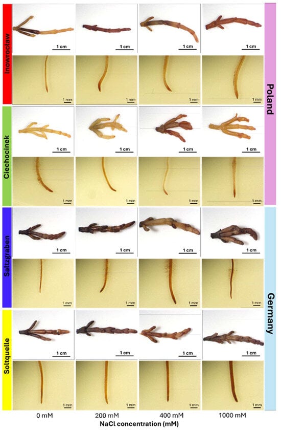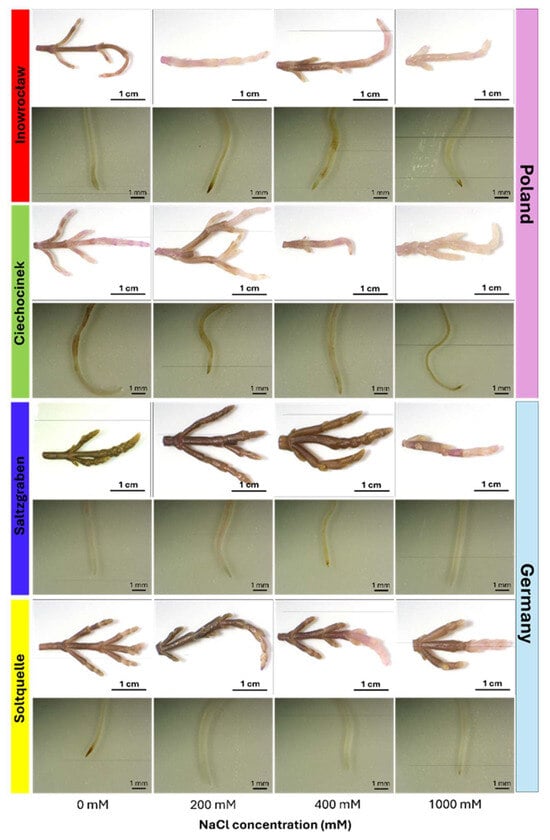 Representative images of shoots (top row) and roots (bottom row) of four S. europaea populations (Inowrocław, Ciechocinek, Salzgraben, and Soltauquelle) treated with different NaCl concentrations (0, 200, 400, and 1000 mM). Samples were stained with Schiff’s reagent to detect MDA-lipid peroxidation, where pale pink colouration indicates the presence of malondialdehyde (MDA) (n = 3).