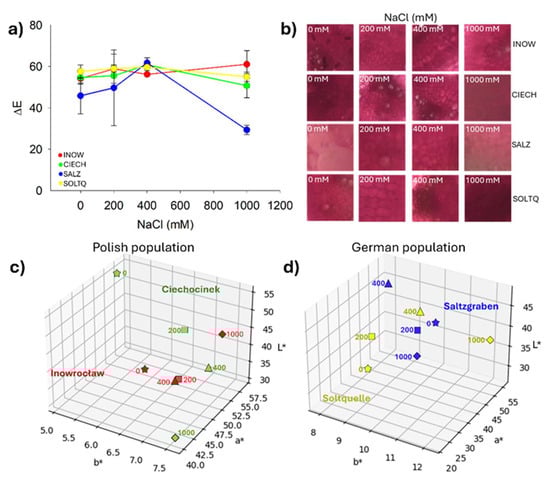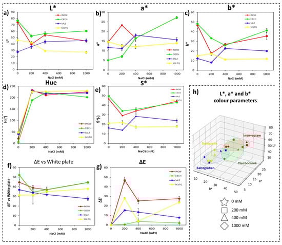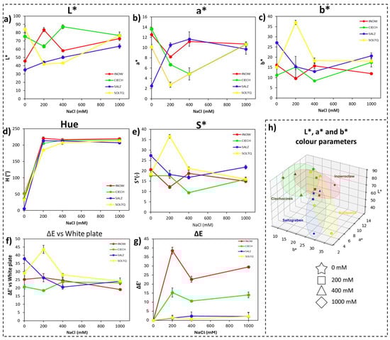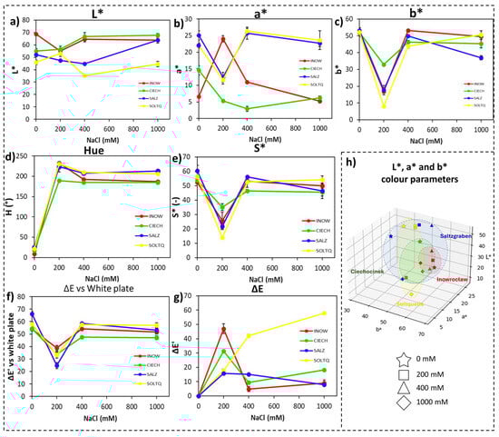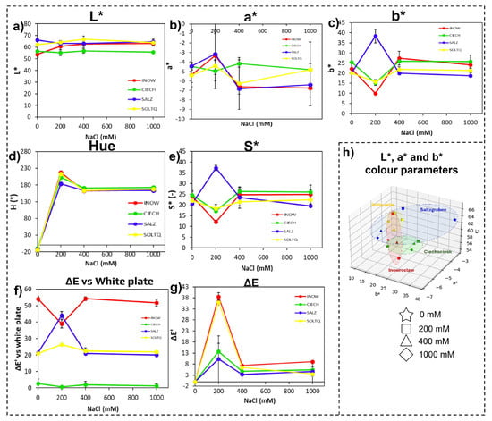 The colour difference versus a white reference (ΔE, Figure 3f) revealed the strongest shifts in Inow and Soltq at 200 mM, while Salz and Ciech exhibited more moderate changes. The intra-treatment colour difference (ΔE’, Figure 3g) highlighted greater variation in Inow and Salz.