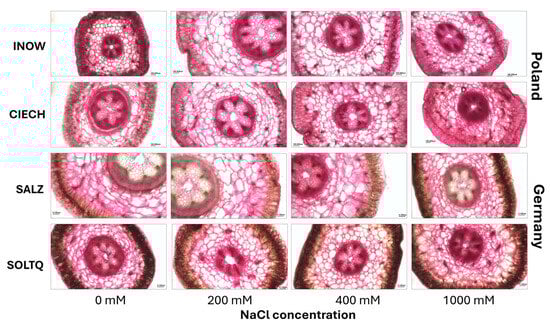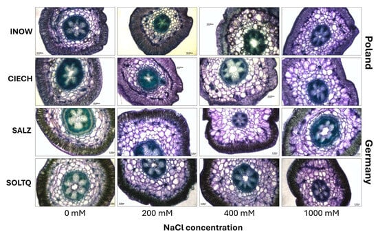 Ruthenium red staining (Figure 10 and Figure 11) demonstrated clear differences in pectin responses. The sharp ΔE peak in Salz at 400 mM, followed by a decline at 1000 mM, suggests active remodelling, potentially linked to pectin de-esterification and ion sequestration in the apoplast [,]. In contrast, Inow, Ciech, and Soltq showed more progressive changes, but with structural weakening at 1000 mM, suggesting lower remodelling capacity. Soltq exhibited moderate and gradual responses, indicative of a more balanced adjustment strategy.