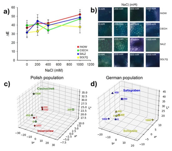 Quantitative colourimetric changes are presented in Figure 10a, where Inow, Ciech, and Soltq showed steady ΔE values up to 400 mM, followed by sharp increases at 1000 mM. Salz exhibited a strong peak at 400 mM and a decrease at 1000 mM, while Soltq displayed more moderate progressive changes. Representative stained tissues (Figure 10b) illustrated these differences in xylem and phloem. Three-dimensional CIELab distributions (Figure 10c,d) confirmed distinct population trajectories under salinity: Ciech spread broadly across the colour space under stress, while Inow showed a more compact cluster. The German populations, Salz and Soltq, also clustered more compactly, highlighting higher colour stability across treatments.