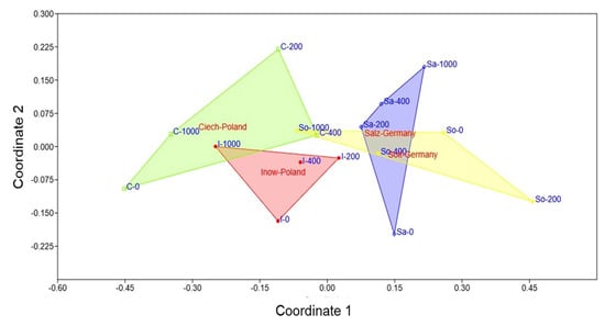 The NMDS ordination yielded a stress value of 0.143, indicating a good representation of the multivariate data. In two dimensions (Figure 11), this revealed a clear separation among populations. Polish populations clustered on the left, associated with stronger oxidative and histochemical responses, while German populations clustered on the right, indicating more stable profiles. Within the Polish group, Inow extended toward both low and high salinity in a compact cluster, whereas Ciech displayed the wider cluster along Coordinate 1. Among German populations, Salz formed a compact cluster along Coordinate 2, while Soltq showed broader dispersion.